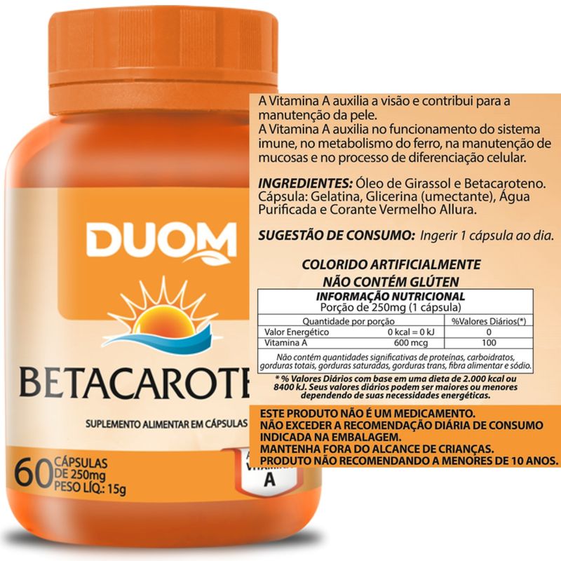 BETACAROTENO COM ÓLEO DE GIRASSOL APENAS 1 CÁPSULA AO DIA 60 CÁPSULAS – DUOM — descrição —Fonte de vitamina A, contribui na proteção da pele contra os efeitos do sol e do envelhecimento precoce. Além de ajudar a manter e prolongar o bronze saudável. O betacaroteno é a fonte mais abundante de pró-vitamina A natural. Após a ingestão o organismo converte o betacaroteno em vitamina A de acordo com sua necessidade. Na natureza o betacaroteno possui como principais fontes: cenoura, abóbora, mamão, manga, batata doce. Também pode ser encontrado em alguns vegetais folhosos como a couve, repolho, espinafre, agrião e brócolis. Alimentos ricos em ômega 3, licopeno e vitamina C melhoram a absorção do betacaroteno. O betacaroteno desempenha um papel importante como antioxidante, eliminando os radicais livres. A vitamina A também é responsável pelo desenvolvimento de tecidos epiteliais, auxiliando na formação da melanina, na melhora da pele e no bom funcionamento da visão. — benefícios —- Auxilia a evitar o envelhecimento da pele;- Protege contra os raios ultravioletas;- Funciona como antioxidante;- Promove um belo bronzeamento.;- Auxilia na visão;- Auxilia na função do sistema imune;- Auxilia no metabolismo do ferro;- Auxilia na manutenção de mucosas;- Auxilia no processo de diferenciação celular. — sugestão de uso —Ingerir 1 cápsula ao dia após o café da manhã ou almoço. — tabela nutricional —**INFORMAÇÃO NUTRICIONAL – EM ANEXO NAS IMAGENS** — composição —Óleo de girassol e Betacaroteno.Cápsula: Gelatina, Glicerina (umectante), Água Purificada e Corante Vermelho Allura.NÃO CONTÉM GLÚTEN. — recomendações —ESTE PRODUTO NÃO É UM MEDICAMENTO.NÃO EXCEDER A RECOMENDAÇÃO DIÁRIA DE CONSUMO INDICADA NA EMBALAGEM.MANTENHA FORA DO ALCANCE DE CRIANÇAS.PRODUTO DESTINADO A PESSOAS ACIMA DE 10 ANOS.Conserve ao abrigo de luz, calor e umidade excessiva e com embalagem fechada. Depois de aberto consumir em até 90 dias. — dados técnicos —Marca – Duom.Fabricante – MM LABORATÓRIO DUOM EIRELE.Conteúdo líquido por frasco – 60 cápsulas.Conteúdo líquido total – 60 cápsulas.Rendimento por frasco – 60 porções/doses.Rendimento total – 60 porções/doses.Peso/concentração por cápsula – 250mg.Peso líquido por frasco – 15g.Peso líquido total – 15g.Peso bruto por frasco – 45g.Peso bruto total – 45g.Peso aproximado produto + embalagem - 150g.Código de barras (EAN) – 7898938440509.Registro ANVISA – Dispensado de registro de acordo com a resolução da RDC 240/2018 da ANVISA.Dimensões do produto – largura: 6 cm; altura: 10 cm; comprimento: 6 cm.Dimensões da embalagem/pacote - largura: 13 cm; altura: 7 cm; comprimento: 16 cm. — itens do anúncio —1 Unidade do produto:BETACAROTENO COM ÓLEO DE GIRASSOL APENAS 1 CÁPSULA AO DIA 60 CÁPSULAS – DUOMTotal – 60 Cápsulas.