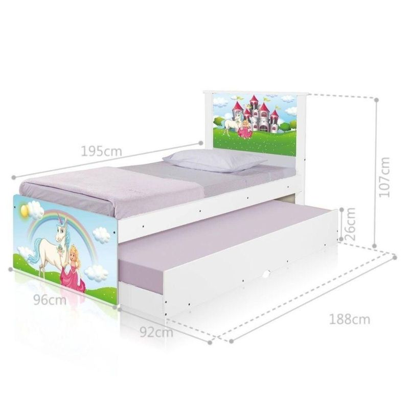 Bi Cama Infantil Solteiro 195cm X 96cm Kmteb Reino Encan.Perfeita para criar um espaço aconchegante, segura e cheio de diversão, nossa bi cama infantil solteira combina conforto, estilo e praticidade. Garantindo ainda mais segurança durante o sono e as brincadeiras. Com designs coloridos e detalhes que estimulam a imaginação, ela é a escolha ideal para deixar o quarto do seu filho ainda mais especial. Feita com materiais de alta qualidade e estrutura resistente, garante segurança e durabilidade para os momentos de descanso e brincadeira. Garanta já a cama que vai fazer o sorriso do seu pequeno brilhar!Especificações Técnicas da Bi Cama Infantil Solteiro:- Altura: 107cm; - Largura: 96cm; - Profundidade: 195cm; - Peso: 36kg; - Peso Suportado: 100kg;Diferenciais da Bi Cama Infantil Solteiro:- Material da Estrutura: Estrutura feita com madeira reforçada de reflorestamento. - Adesivo: Adesivo de vinil MUITO RESISTENTE e que NÃO DESCOLA. - Acompanhamentos: Acompanha proteção lateral.Recomendações de limpeza:-Limpar com flanela limpa e seca. Não molhar o móvel e não expor em lugar úmido ou próximo de fontes de calor. Não usar produtos abrasivos.Observações Importantes:- NÃO ACOMPANHA COLCHÃO; medidas para o colchão 88x188cm. - As imagens ambientadas são meramente ilustrativas e podem apresentar itens que não compõe o produto; - Objetos decorativos que aparecem na foto não acompanham o produto; - A Bi Cama Infantil Solteira chegará desmontada para você, embora a dificuldade de montagem seja baixa, recomendamos que seja feita por um profissional; - Confira as dimensões antes da compra e certifique-se de que o produto passará por elevadores, portas e corredores, já que nossa entrega não inclui a subida de lances de escada, ou o lançamento de produtos; - Ao receber seus produtos, verifique no ato do recebimento qualquer dano na embalagem. Caso tenha alguma avaria, favor não assinar o comprovante de recebimento; - Produto para uso residencial em ambiente interno, não devendo ficar exposto diretamente ao sol, calor e umidades excessivas.