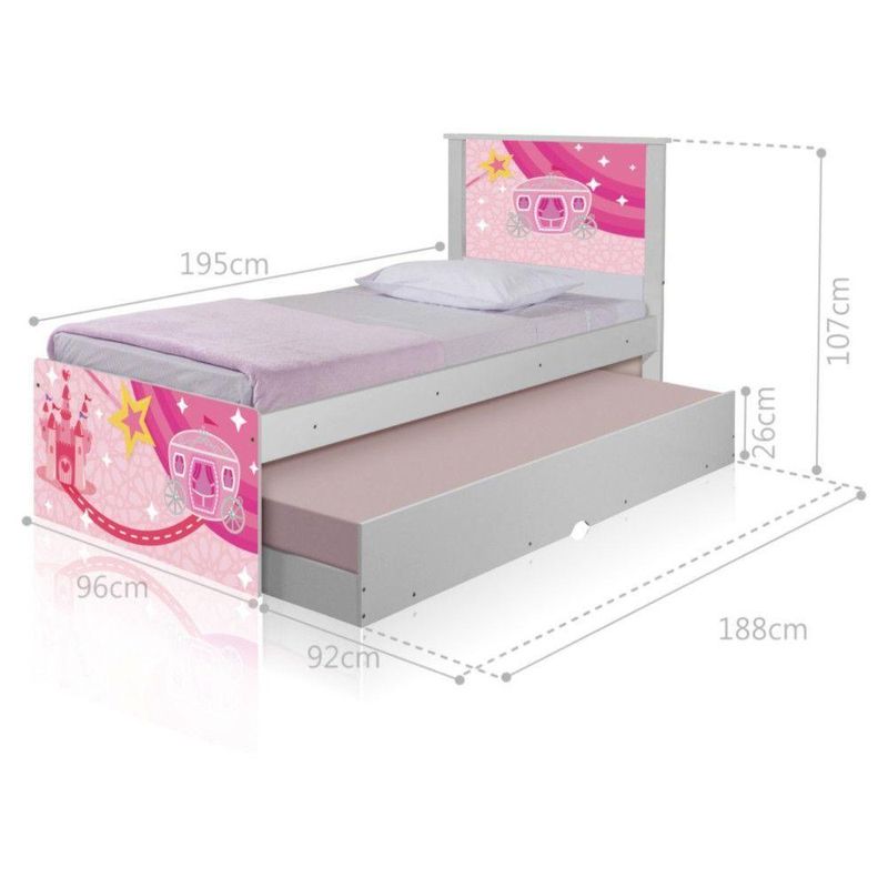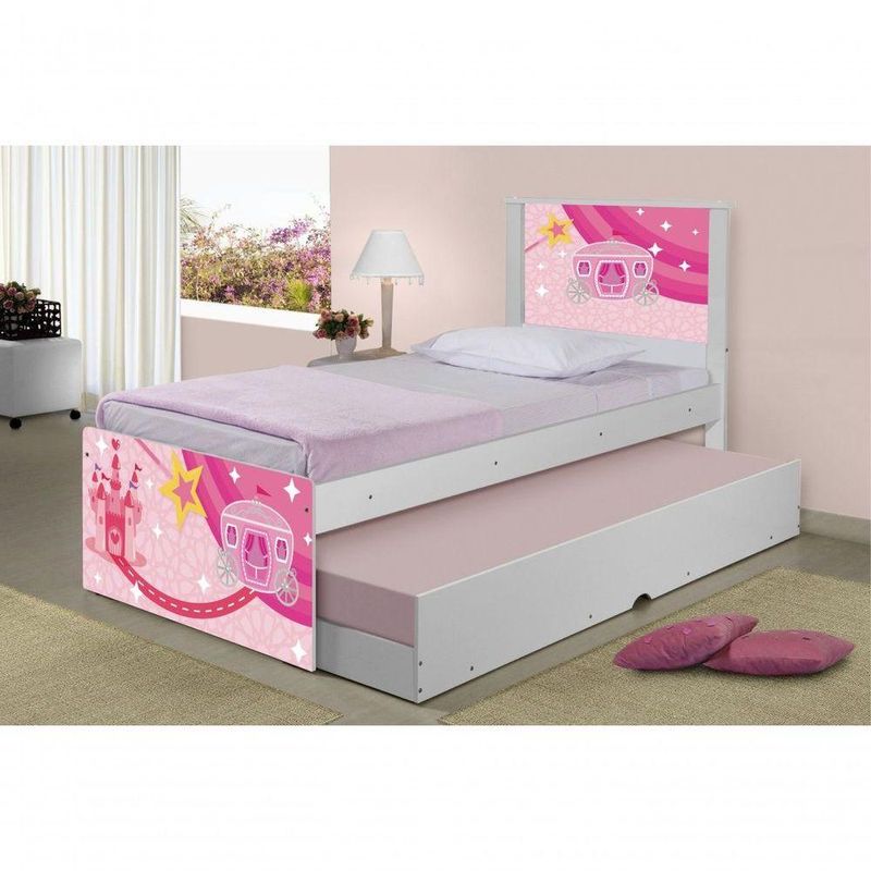 Bicama Carruagem CasteloBicama Juvenil Barcelona Adesivada Carruagem Castelo - BrancoRef. 1427A Bicama Juvenil Barcelona Adesivada Carruagem Castelo é belíssima e conta com um design funcional, que ocupa pouco espaço no ambiente.A Coleção Carruagem Castelo foi desenvolvida por nossos designers oferecendo um visual exclusivo, descontraído e divertido ao ambiente.A cama auxiliar fica embaixo da principal e basta puxá-la por meio das corrediças para começar a fazer dela.É ideal para quartos pequenos e para caso precise de uma cama extra para receber um amigo, ou divida o dormitório com alguém.Feita em MDF e MDP e seu acabamento é feito com pintura UV brilhante tornando-a um produto resistente e com aspecto de novo por muito mais tempo.É uma excelente escolha para acomodar colchões de solteiro na medida de 188 cm x 88 cm de largura.- Medidas da Cama:Altura: 107 cmLargura: 96 cmComprimento: 195 cm- Medidas da Cama Auxiliar:Altura: 26 cmLargura: 188 cmComprimento: 92 cmInformações do produto:- Cor do produto: Branco- Material: MDF/MDP- Ideal para colchões de: 88 cm x 188 cm - solteiro (colchão não incl)- Garantia: 3 meses contra de fabricação.- Peso máximo suportado: 95 kg por cama.Itens Incls:01 Cama Solteiro com Cama Auxiliar.Kit completo para montagem, manual detalhado de instruções.Informações complementares:- Fotos meramente ilustrativas do produto no ambiente.- Verificar descrição e tamanho do produto antes da compra.- Avaliar a mercadoria no ato do recebimento e recusar em caso de divergência ou s.- Mantenha as informações de contato e endereço de entrega atualizados para entrarmos em contato caso necessário.* Sugerimos a contratação de um montador para a montagem do produto. Não nos responsabilizamos por s cas no ato da montagem.* Não nos responsabilizamos pela montagem e desmontagem do produto no ato da entrega e devolução, assim como os custos gerados nestas situações.* A transportadora entregará o produto no andar térreo do endereço de entrega.* Não nos responsabilizamos por subir escadas, corredores e elevadores ou transporte por guincho em apartamentos.