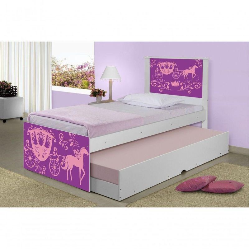 Bicama Carruagem Princesa Com ColchõesBicama Juvenil Barcelona Adesivada Carruagem Princesa com 2 Colchões - BrancoRef. 1426A Bicama Juvenil Barcelona Adesivada Carruagem Princesa é belíssima e conta com um design funcional, que ocupa pouco espaço no ambiente.A Coleção Carruagem Princesa foi desenvolvida por nossos designers oferecendo um visual exclusivo, descontraído e divertido ao ambiente.A cama auxiliar fica embaixo da principal e basta puxá-la por meio das corrediças para começar a fazer dela.É ideal para quartos pequenos e para caso precise de uma cama extra para receber um amigo, ou divida o dormitório com alguém.Feita em MDF e MDP e seu acabamento é feito com pintura UV brilhante tornando-a um produto resistente e com aspecto de novo por muito mais tempo.É uma excelente escolha para acomodar colchões de solteiro na medida de 188 cm x 88 cm de largura.- Medidas da Cama:Altura: 107 cmLargura: 96 cmComprimento: 195 cm- Medidas da Cama Auxiliar:Altura: 26 cmLargura: 188 cmComprimento: 92 cmInformações do produto:- Cor do produto: Branco- Material: MDF/MDP- Colchão Incl: 2 unidades (88cm x 188cm - solteiro)- Tipo de Colchão: Espuma D20- Garantia: 3 meses contra de fabricação.- Peso máximo suportado: 95 kg por cama.Itens Incls:01 Cama Solteiro com Cama Auxiliar.02 Colchões solteiro D20 88cm x 188cm.Kit completo para montagem, manual detalhado de instruções.Informações complementares:- Fotos meramente ilustrativas do produto no ambiente.- Verificar descrição e tamanho do produto antes da compra.- Avaliar a mercadoria no ato do recebimento e recusar em caso de divergência ou s.- Mantenha as informações de contato e endereço de entrega atualizados para entrarmos em contato caso necessário.* Sugerimos a contratação de um montador para a montagem do produto. Não nos responsabilizamos por s cas no ato da montagem.* Não nos responsabilizamos pela montagem e desmontagem do produto no ato da entrega e devolução, assim como os custos gerados nestas situações.* A transportadora entregará o produto no andar térreo do endereço de entrega.* Não nos responsabilizamos por subir escadas, corredores e elevadores ou transporte por guincho em apartamentos.