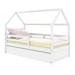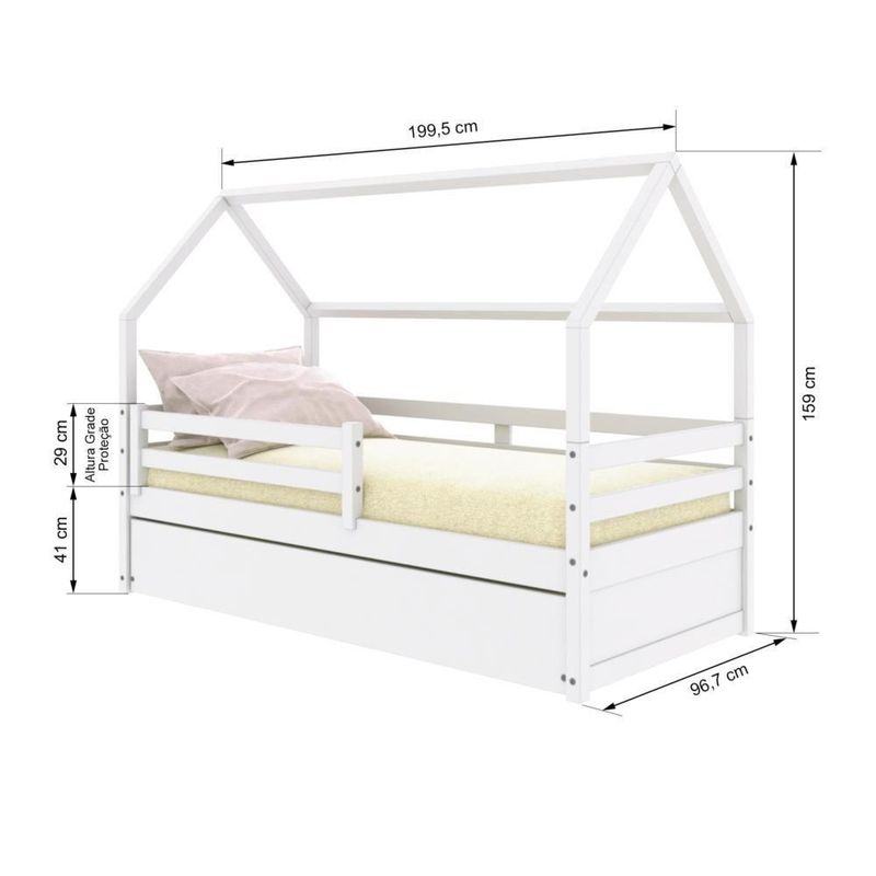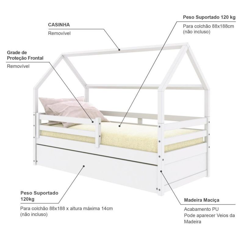 Bicama Casinha Solteiro Slim Rb Com Grade De Proteção Branco HousinDETALHES DO PRODUTOMaterial: Madeira Maciça de Pinus de ReflorestamentoPintura/Acabamento: Branco PU (pode mostrar veios da madeira)Medida do Colchão da Cama (cm x cm): 188x88 (Não incluso)Medida do Colchão da Cama Auxiliar (cm x cm): 188x88 *14 (Altura Máxima Recomendada) (Não incluso)Peso Suportado Cama :120 KgPeso Suportado Cama Auxiliar :120 KgDiferenciais:Todo em Madeira, Auxiliar com 4 rodízios, Casinha, Grade Removível.DIMENSÕES CAMALargura (cm):199,5Altura (cm):159Profundidade (cm):96,7DIMENSÕES CAMA AUXILIARLargura (cm):189Altura (cm):26Profundidade (cm):94INFORMAÇÕES COMPLEMENTARESNecessita de Montagem:SIM (Acompanha Manual de montagem)Atenção:Não realizamos serviço de montagem e instalação. Imagens meramente ilustrativas. Cores e tonalidades podem variar.Garantia do Fabricante:Prazo de 3 meses por defeito de fabricaçãoEMBALAGEMPeso (Kg):52Quantidade de Volumes:04 Material Principal: Madeira Maciça | Cor: Branco | Necessita Montagem: Sim | Acompanha Colchão: Não | Tipo de Cama: Bicama