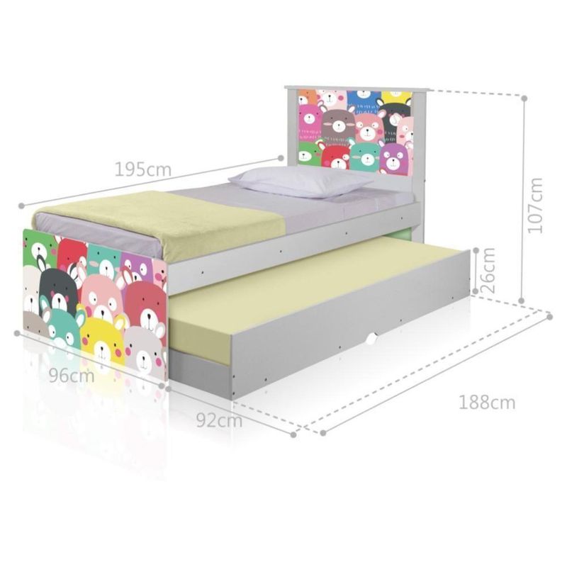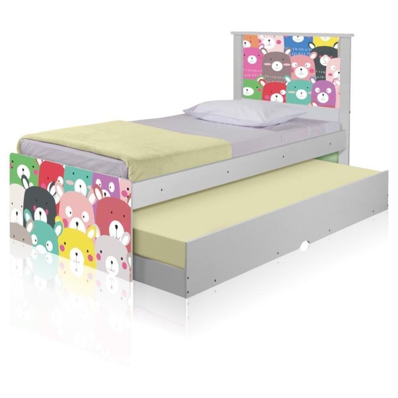 Bicama Juvenil Adesivada Ursinhos Coloridos Com ColchõesBicama Bibox Juvenil Barcelona Adesivada Ursinhos Coloridos com 2 Colchões - BrancoRef. 1410A Bicama Bibox Juvenil Barcelona Adesivada Ursinhos Coloridos é belíssima e conta com um design funcional, que ocupa pouco espaço no ambiente.A Coleção Ursinhos Coloridos foi desenvolvida por nossos designers oferecendo um visual exclusivo, descontraído e divertido ao ambiente.A cama auxiliar fica embaixo da principal e basta puxá-la por meio das corrediças para começar a fazer uso dela.É ideal para quartos pequenos e para caso precise de uma cama extra para receber um amigo, ou divida o dormitório com alguém.Feita em MDF e MDP e seu acabamento é feito com pintura UV brilhante tornando-a um produto resistente e com aspecto de novo por muito mais tempo.ACOMPANHA COLCHÕES DE 12X88X188|CAMA AUXILIAR PODE SER MONTADA DOS DOIS LADOS- Medidas da Cama:Altura: 107 cmLargura: 96 cmComprimento: 195 cm- Medidas da Cama Auxiliar:Altura: 26 cmLargura: 188 cmComprimento: 92 cmInformações do produto:- Cor do produto: Branco- Material: MDF/MDP- Colchão Incluso: 2 unidades (88cm x 188cm - solteiro)- Tipo de Colchão: Espuma D20- Garantia: 3 meses contra defeito de fabricação.- Peso máximo suportado: 95 kg por cama.Itens Inclusos:01 Cama Solteiro com Cama Auxiliar.02 Colchões solteiro D20 88cm x 188cm.Kit completo para montagem, manual detalhado de instruções.Informações complementares:- Fotos meramente ilustrativas do produto no ambiente.- Verificar descrição e tamanho do produto antes da compra.- Avaliar a mercadoria no ato do recebimento e recusar em caso de divergência ou avarias.- Mantenha as informações de contato e endereço de entrega atualizados para entrarmos em contato caso necessário.* Sugerimos a contratação de um montador profissional para a montagem do produto. Não nos responsabilizamos por avarias causadas no ato da montagem.* Não nos responsabilizamos pela montagem e desmontagem do produto no ato da entrega e devolução, assim como os custos gerados nestas situações.* A transportadora entregará o produto no andar térreo do endereço de entrega.* Não nos responsabilizamos por subir escadas, corredores e elevadores ou transporte por guincho em apartamentos.MARCA: Kids Mobili | LARGURA DO PRODUTO (CM): 96 | COMPRIMENTO DO PRODUTO (CM): 195 | MATERIAL PRINCIPAL: Madeira | TIPO DE CAMA: Padrão | MATERIAL PARA FILTRO: Madeira | GÊNERO: Unissex | COR PREDOMINANTE: Branco | ALTURA DO PRODUTO (CM): 107 | POSSUI COLCHÃO: Sim | PRODUTO PRECISA DE MONTAGEM?: Sim | MODELO DE CAMA: Bicama | PRODUTO: 01-Bicama + 02-Colchões | CLASSIFICAÇÃO DA CAMA: Solteiro | LARGURA PRODUTO COM EMBALAGEM (CM): 88 | ESTADO DE ORIGEM: SP | ALTURA DO PRODUTO COM EMBALAGEM (CM): 53 | QUANTIDADES DE CAIXAS DE EMBALAGEM: 4 | INSTRUÇÕES/CUIDADOS: Avaliar a mercadoria no ato do recebimento e recusar em caso de divergência ou avarias. Evitar de fazer a limpeza com produtos químicos e danosos ao produto | PESO SUPORTADO (KG): 95 | COMPRIMENTO PRODUTO COM EMBALAGEM (CM): 195 | PESO PRODUTO COM EMBALAGEM (KG): 46,9 | PESO DO PRODUTO (KG): 46,9 | DESCRIÇÃO DO TAMANHO: 107x96x195cm | CONTEÚDO DA EMBALAGEM: 01-Bicama + 02-Colchões | INCLUI MANUAL DE MONTAGEM: Sim | CORES DO PRODUTO (FILTRO DE CORES): Branco