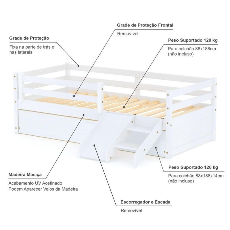 Bicama Solteiro Dreams E Mini Escada/escorregador Branco MegamobiliaDETALHES DO PRODUTOMaterial: Madeira Maciça de Pinus de ReflorestamentoPintura/Acabamento: Branco UV (Pode mostrar os veios da madeira)Medida do Colchão da Cama (cm x cm): 188x88 (Não incluso)Medida do Colchão da Cama Auxiliar (cm x cm): 188x88 *14 (Altura Máxima Recomendada) (Não incluso)Peso Suportado Cama :120 KgPeso Suportado Cama Auxiliar :120 KgDiferenciais:Todo em Madeira, Auxiliar com 4 rodízios e Grade de Proteção, Grade Removível e Kit Escadinha/Escorrega.DIMENSÕES CAMALargura (cm):199,5Altura (cm):68Profundidade (cm):96,7DIMENSÕES CAMA AUXILIARLargura (cm):189Altura (cm):26Profundidade (cm):94INFORMAÇÕES COMPLEMENTARESNecessita de Montagem:SIM (Acompanha Manual de montagem)Atenção:Não realizamos serviço de montagem e instalação. Imagens meramente ilustrativas. Cores e tonalidades podem variar.Garantia do Fabricante:Prazo de 3 meses por defeito de fabricaçãoEMBALAGEMPeso (Kg):52Quantidade de Volumes:4 Material Principal: Madeira | Cor Predominante: Branco | Necessita Montagem: Sim | Acompanha Colchão: Não | Tamanho da Cama: 88 | Tipo de Cama: Bicama | Altura: 68 | Largura: 96,7 | Peso máximo suportado: 120 | Peso: 36 | Comprimento: 199,5 | Cor Via: Branco | Altura com Embalagem: 68 | Largura com Embalagem: 96,7 | Comprimento com Embalagem: 199,5 | Peso com Embalagem: 36 | Descrição do Tamanho: 68 x 96,7 x 199,5