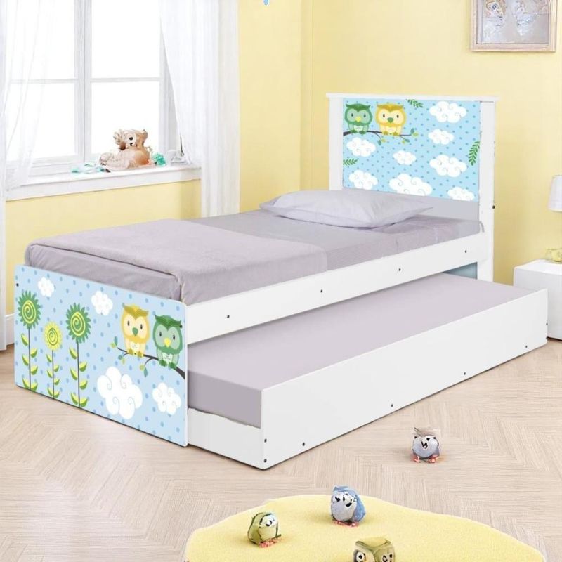 Bicama Solteiro Hop Com Cabeceira CorujinhasA Bicama Bibox Juvenil Adesivada é belíssima e conta com um design funcional, que ocupa pouco espaço no ambiente.A cama auxiliar fica embaixo da principal e basta puxá-la por meio das corrediças para começar a fazer uso dela.É ideal para quartos pequenos e para caso precise de uma cama extra para receber um amigo, ou divida o dormitório com alguém.Feita em MDF e MDP e seu acabamento é feito com pintura UV brilhante tornando-a um produto resistente e com aspecto de novo por muito mais tempo.É uma excelente escolha para acomodar colchões de solteiro na medida de 188 cm x 88 cm de largura.INDICADO COLCHÕES DE 12X88X188 |CAMA AUXILIAR PODE SER MONTADA DOS DOIS LADOS - Medidas da Cama:Altura: 107 cmLargura: 96 cmComprimento: 195 cm - Medidas da Cama Auxiliar:Altura: 26 cmLargura: 188 cmComprimento: 92 cm Informações do produto:- Cor do produto: Branco- Material: MDF/MDPPés: NãoGavetas: NãoPrateleiras: NãoNichos: Não- Ideal para colchões de: 88 cm x 188 cm - solteiro (colchão não incluso)- Garantia: 3 meses contra defeito de fabricação.- Peso máximo suportado: 95 kg por cama. Itens Inclusos:01 Cama Solteiro com Cama Auxiliar.Kit completo para montagem, manual detalhado de instruções. Informações complementares:- Fotos meramente ilustrativas do produto no ambiente.- Verificar descrição e tamanho do produto antes da compra.- Avaliar a mercadoria no ato do recebimento e recusar em caso de divergência ou avarias.- Mantenha as informações de contato e endereço de entrega atualizados para entrarmos em contato caso necessário.* Sugerimos a contratação de um montador profissional para a montagem do produto. Não nos responsabilizamos por avarias causadas no ato da montagem.* Não nos responsabilizamos pela montagem e desmontagem do produto no ato da entrega e devolução, assim como os custos gerados nestas situações.* A transportadora entregará o produto no andar térreo do endereço de entrega.* Não nos responsabilizamos por subir escadas, corredores e elevadores ou transporte por guincho em apartamentos. ALTURA DO PRODUTO (CM): 107 | LARGURA DO PRODUTO (CM): 96 | COMPRIMENTO DO PRODUTO (CM): 195 | MATERIAL PRINCIPAL: Madeira | TIPO DE CAMA: Padrão | COR PREDOMINANTE: Branco | POSSUI COLCHÃO: Não | GÊNERO: Unissex | PESO SUPORTADO (KG): 95 | ALTURA DO PRODUTO COM EMBALAGEM (CM): 25 | LARGURA PRODUTO COM EMBALAGEM (CM): 52 | COMPRIMENTO PRODUTO COM EMBALAGEM (CM): 195 | DESCRIÇÃO DO TAMANHO: 107x96x195cm | MATERIAL PARA FILTRO: Madeira | ESTADO DE ORIGEM: PR | CONTEÚDO DA EMBALAGEM: 1-Cama | INSTRUÇÕES/CUIDADOS: Avaliar a mercadoria no ato do recebimento e recusar em caso de divergência ou avarias. Evitar de fazer a limpeza com produtos químicos e danosos ao produto | PRODUTO PRECISA DE MONTAGEM?: Sim | MARCA: Casah | PRODUTO: 1-Cama | CLASSIFICAÇÃO DA CAMA: Solteiro | MODELO DE CAMA: Com Auxiliar | CORES DO PRODUTO (FILTRO DE CORES): Branco | QUANTIDADES DE CAIXAS DE EMBALAGEM: 3 | INCLUI MANUAL DE MONTAGEM: Sim | PESO PRODUTO COM EMBALAGEM (KG): 36,7 | PESO DO PRODUTO (KG): 37,5