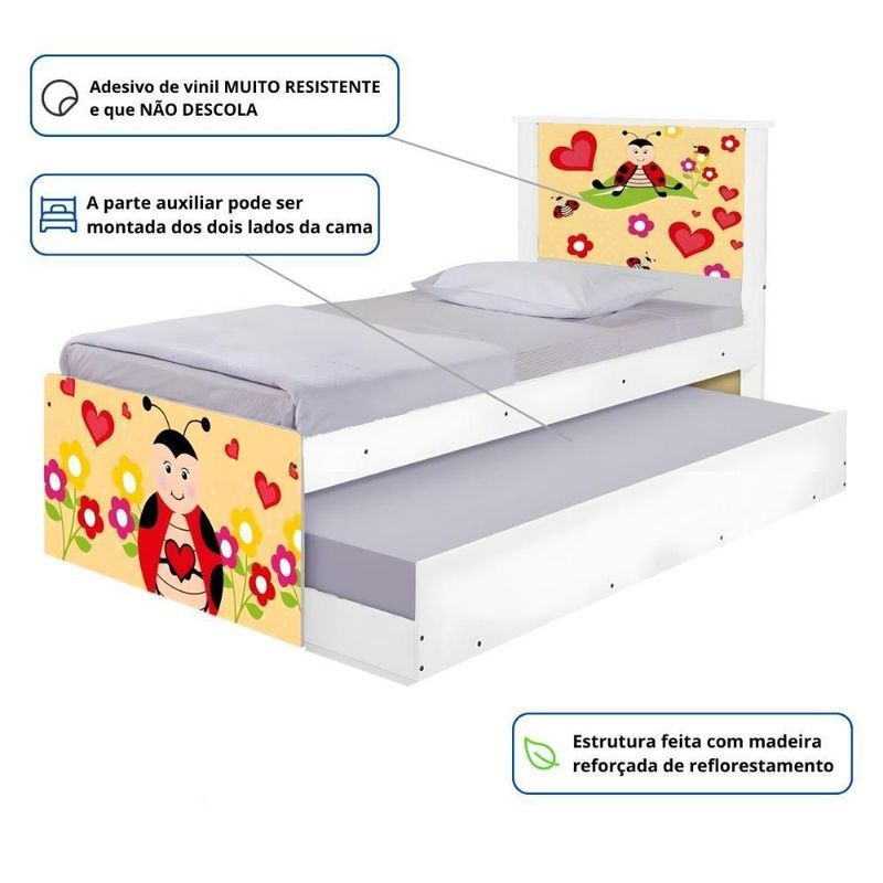 Bicama Solteiro Hop Com Cabeceira JoaninhaA Bicama Bibox Juvenil Adesivada é belíssima e conta com um design funcional, que ocupa pouco espaço no ambiente.A cama auxiliar fica embaixo da principal e basta puxá-la por meio das corrediças para começar a fazer uso dela.É ideal para quartos pequenos e para caso precise de uma cama extra para receber um amigo, ou divida o dormitório com alguém.Feita em MDF e MDP e seu acabamento é feito com pintura UV brilhante tornando-a um produto resistente e com aspecto de novo por muito mais tempo.INDICADO COLCHÕES DE 12X88X188 |CAMA AUXILIAR PODE SER MONTADA DOS DOIS LADOS - Medidas da Cama:Altura: 107 cmLargura: 96 cmComprimento: 195 cm - Medidas da Cama Auxiliar:Altura: 26 cmLargura: 188 cmComprimento: 92 cm Informações do produto:- Cor do produto: Branco- Material: MDF/MDPPés: NãoGavetas: NãoPrateleiras: NãoNichos: Não- Ideal para colchões de: 88 cm x 188 cm - solteiro (colchão não incluso)- Garantia: 3 meses contra defeito de fabricação.- Peso máximo suportado: 95 kg por cama. Itens Inclusos:01 Cama Solteiro com Cama Auxiliar.Kit completo para montagem, manual detalhado de instruções. Informações complementares:- Fotos meramente ilustrativas do produto no ambiente.- Verificar descrição e tamanho do produto antes da compra.- Avaliar a mercadoria no ato do recebimento e recusar em caso de divergência ou avarias.- Mantenha as informações de contato e endereço de entrega atualizados para entrarmos em contato caso necessário.* Sugerimos a contratação de um montador profissional para a montagem do produto. Não nos responsabilizamos por avarias causadas no ato da montagem.* Não nos responsabilizamos pela montagem e desmontagem do produto no ato da entrega e devolução, assim como os custos gerados nestas situações.* A transportadora entregará o produto no andar térreo do endereço de entrega.* Não nos responsabilizamos por subir escadas, corredores e elevadores ou transporte por guincho em apartamentos. GÊNERO: Unissex | PRODUTO: 1-Cama | LARGURA PRODUTO COM EMBALAGEM (CM): 52 | CORES DO PRODUTO (FILTRO DE CORES): Branco | ALTURA DO PRODUTO COM EMBALAGEM (CM): 25 | MODELO DE CAMA: Com Auxiliar | PESO SUPORTADO (KG): 95 | CLASSIFICAÇÃO DA CAMA: Solteiro | TIPO DE CAMA: Padrão | INSTRUÇÕES/CUIDADOS: Avaliar a mercadoria no ato do recebimento e recusar em caso de divergência ou avarias. Evitar de fazer a limpeza com produtos químicos e danosos ao produto | POSSUI COLCHÃO: Não | MARCA: Casah | LARGURA DO PRODUTO (CM): 96 | MATERIAL PARA FILTRO: Madeira | MATERIAL PRINCIPAL: Madeira | ALTURA DO PRODUTO (CM): 107 | DESCRIÇÃO DO TAMANHO: 107x96x195cm | CONTEÚDO DA EMBALAGEM: 1-Cama | PESO PRODUTO COM EMBALAGEM (KG): 36,7 | INCLUI MANUAL DE MONTAGEM: Sim | PESO DO PRODUTO (KG): 37,5 | COR PREDOMINANTE: Branco | PRODUTO PRECISA DE MONTAGEM?: Sim | COMPRIMENTO DO PRODUTO (CM): 195 | ESTADO DE ORIGEM: PR | COMPRIMENTO PRODUTO COM EMBALAGEM (CM): 195 | QUANTIDADES DE CAIXAS DE EMBALAGEM: 3