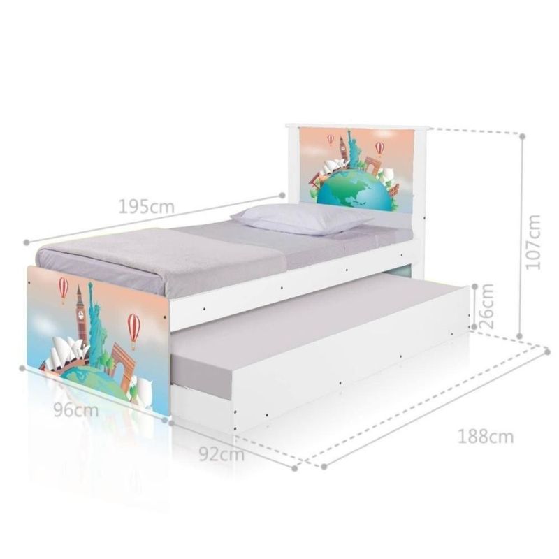 Bicama Solteiro Hop Com Cabeceira Volta Ao MundoA Bicama Bibox Juvenil Adesivada é belíssima e conta com um design funcional, que ocupa pouco espaço no ambiente.A cama auxiliar fica embaixo da principal e basta puxá-la por meio das corrediças para começar a fazer uso dela.É ideal para quartos pequenos e para caso precise de uma cama extra para receber um amigo, ou divida o dormitório com alguém.Feita em MDF e MDP e seu acabamento é feito com pintura UV brilhante tornando-a um produto resistente e com aspecto de novo por muito mais tempo.INDICADO COLCHÕES DE 12X88X188 |CAMA AUXILIAR PODE SER MONTADA DOS DOIS LADOS - Medidas da Cama:Altura: 107 cmLargura: 96 cmComprimento: 195 cm - Medidas da Cama Auxiliar:Altura: 26 cmLargura: 188 cmComprimento: 92 cm Informações do produto:- Cor do produto: Branco- Material: MDF/MDPPés: NãoGavetas: NãoPrateleiras: NãoNichos: Não- Ideal para colchões de: 88 cm x 188 cm - solteiro (colchão não incluso)- Garantia: 3 meses contra defeito de fabricação.- Peso máximo suportado: 95 kg por cama. Itens Inclusos:01 Cama Solteiro com Cama Auxiliar.Kit completo para montagem, manual detalhado de instruções. Informações complementares:- Fotos meramente ilustrativas do produto no ambiente.- Verificar descrição e tamanho do produto antes da compra.- Avaliar a mercadoria no ato do recebimento e recusar em caso de divergência ou avarias.- Mantenha as informações de contato e endereço de entrega atualizados para entrarmos em contato caso necessário.* Sugerimos a contratação de um montador profissional para a montagem do produto. Não nos responsabilizamos por avarias causadas no ato da montagem.* Não nos responsabilizamos pela montagem e desmontagem do produto no ato da entrega e devolução, assim como os custos gerados nestas situações.* A transportadora entregará o produto no andar térreo do endereço de entrega.* Não nos responsabilizamos por subir escadas, corredores e elevadores ou transporte por guincho em apartamentos. ALTURA DO PRODUTO (CM): 107 | MATERIAL PRINCIPAL: Madeira | TIPO DE CAMA: Padrão | COR PREDOMINANTE: Branco | POSSUI COLCHÃO: Não | PESO SUPORTADO (KG): 95 | ALTURA DO PRODUTO COM EMBALAGEM (CM): 25 | COMPRIMENTO PRODUTO COM EMBALAGEM (CM): 195 | PESO PRODUTO COM EMBALAGEM (KG): 36,7 | PESO DO PRODUTO (KG): 37,5 | MATERIAL PARA FILTRO: Madeira | INCLUI MANUAL DE MONTAGEM: Sim | CORES DO PRODUTO (FILTRO DE CORES): Branco | MODELO DE CAMA: Com Auxiliar | QUANTIDADES DE CAIXAS DE EMBALAGEM: 3 | MARCA: Casah | INSTRUÇÕES/CUIDADOS: Avaliar a mercadoria no ato do recebimento e recusar em caso de divergência ou avarias. Evitar de fazer a limpeza com produtos químicos e danosos ao produto | COMPRIMENTO DO PRODUTO (CM): 195 | LARGURA DO PRODUTO (CM): 96 | ESTADO DE ORIGEM: PR | CLASSIFICAÇÃO DA CAMA: Solteiro | PRODUTO: 1-Cama | CONTEÚDO DA EMBALAGEM: 1-Cama | PRODUTO PRECISA DE MONTAGEM?: Sim | DESCRIÇÃO DO TAMANHO: 107x96x195cm | LARGURA PRODUTO COM EMBALAGEM (CM): 52 | GÊNERO: Unissex