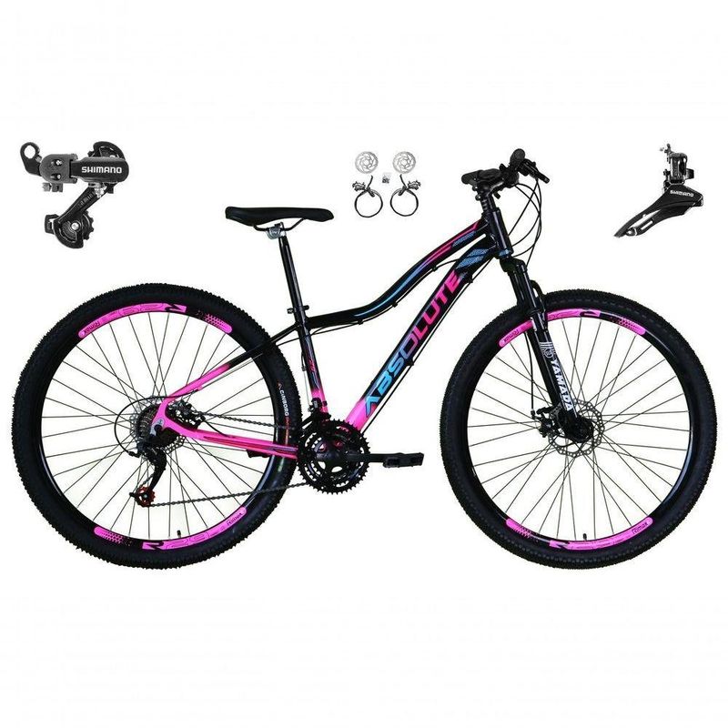 Bicicleta Aro 29 Absolute Hera Feminina 21v Alumínio Câmbios Shimano Freio Hidráulico Preto/Rosa 15Linda bike aro 29 em alumínio, nova na caixa a pronta entrega, produto com ótima qualidade e acabamento, possui 21 marchas com sistema de alavancas rapid fire que a cada clique uma marcha é trocada, cambios Shimano, garfo com suspensão, sistema de freio a disco hidraulico. Segue abaixo características da bike:Quadro Absolute Hera AlumínioGarfo 29 suspensão curso 60mmSuporte do guidão em alumínio PretoGuidão 31.8mm PretoCanote do selim 27.2Selim Sport PretoAbraçadeira do Selim alumínio PretoAros Aero Parede dupla reforçadoRaios PretosCubos Pretos com blocagensPneus 29 CravudinhosMovimento central selado rolamentadoFreios a disco hidraulico com discos inox 160mmAlavancas Semi-automáticas Rapid FireCâmbio Traseiro Shimano TZCâmbio Dianteiro Shimano TZCorrente IndexPedivela Aço RevestidoPedal Plataforma Nylon PretoRoda Livre 7v index (rosca)Bicicleta pré montada, vai precisar apenas fixar a roda dianteira, guidão, selim e pedais. Recomendamos que seja feita uma revisão por um técnico após a recebimento do produto, para reajuste e regulagem, pois no transporte pode acontecer de alguma peça soltar ou desregularFotos meramente ilustrativas