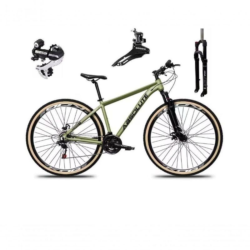Bicicleta Aro 29 Absolute Nero 5 Câmbio Shimano 24v Acera K7 Freio A Disco Garfo Com Trava Oliva 17Bike aro 29 em alumínio, nova na caixa a pronta entrega, produto com ótima qualidade e acabamento, possui 24 marchas com sistema de alavancas rapid fire que a cada clique uma marcha é trocada, garfo com suspensão, sistema de freio a disco mecânico, câmbio dianteiro Shimano Tz e traseiro Shimano Acera M360. Garfo com trava no ombro e regulagem, sistema de cubos e catraca k7 de encaixe.Segue abaixo características da bike:Quadro 29 Absolute Nero 5 em alumínioGarfo 29 suspensão curso 100mm com TravaSuporte do guidão em alumínio PretoGuidão 31.8mm em alumínio PretoCanote do selim 27.2 com carrinhoSelim Sport PretoAbraçadeira do Selim alumínio PretoAros Aero Parede dupla reforçadoRaios PretosCubos Pretos Alumínio k7Pneus 29 cravudosMovimento central selado rolamentadoFreios a disco Mecânicos com discos inox 160mmAlavancas Semi-automáticas Rapid FireCâmbio Traseiro Index Shimano Acera m360Câmbio Dianteiro Index Shimano TzCorrente Index 24vPedivela Aço RevestidoPedal Plataforma Nylon PretoCassete 8v gta sunrun (encaixe)Bicicleta pré montada, vai precisar apenas fixar a roda dianteira, guidão, selim e pedais. Recomendamos que seja feita uma revisão por um técnico após a recebimento do produto, para reajuste e regulagem, pois no transporte pode acontecer de alguma peça soltar ou desregularFotos meramente ilustrativas