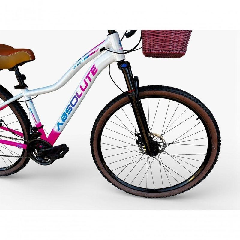 Bicicleta Aro 29 Feminina Absolute Hera Retrô Vintage 21v Hidráulica Confortável Cesta Selim 2 Molas - Branco/rosa Tam15Uma bicicleta que desperta nostalgia à primeira vista, mas surpreende nos detalhes. ; ; ;Inspirada no estilo retrô/vintage, este modelo une o charme clássico com o que há de melhor na modernidade, ; ; ;entregando uma experiência de pedal extremamente confortável e prazerosa. ; ; ;Seu grande destaque é o conforto: selim largo com duas molas super macias, ; ; ;ideal para passeios longos, manoplas tipo couro agradáveis ao toque e uma cesta grande e prática, ; ; ;perfeita para o dia a dia. É a escolha ideal para quem busca estilo, ; ; ;conforto e funcionalidade em uma única bicicleta. ; ; ; ; ; ; ;Quadro Absolute Hera Alumínio ; ; ; ; ; ; ;Garfo 29 suspensão curso 60mm ; ; ; ; ; ; ;Suporte do guidão em alumínio preto ; ; ; ; ; ; ;Guidão alto confort preto ; ; ; ; ; ; ;Canote do selim 27.2mm ; ; ; ; ; ; ;Selim Super confort 2 molas marrom/bege ; ; ; ; ; ; ;Manoplas couro confort plus ; ; ; ; ; ; ;Abraçadeira do Selim alumínio Preto ; ; ; ; ; ; ;Aros Aero Parede dupla reforçado ; ; ; ; ; ; ;Raios Pretos ; ; ; ; ; ; ;Cubos Pretos com blocagens ; ; ; ; ; ; ;Pneus 29 Cravudinhos com faixa ; ; ; ; ; ; ;Movimento central selado rolamentado ; ; ; ; ; ; ;Freios a disco Hidraulico com discos inox 160mm ; ; ; ; ; ; ;Alavancas Semi-automáticas Rapid Fire ; ; ; ; ; ; ;Câmbio Traseiro Index Importado ; ; ; ; ; ; ;Câmbio Dianteiro Importado ; ; ; ; ; ; ;Corrente Index ; ; ; ; ; ; ;Pedivela Aço Revestido ; ; ; ; ; ; ;Pedal Plataforma Nylon preto ; ; ; ; ; ; ;Roda Livre 7v index (rosca) ; ; ; ; ; ; ;Kit Pisca LED dianteiro/traseiro ; ; ; ; ; ; ;Bicicleta pré montada, vai precisar apenas fixar a roda dianteira, guidão, selim e pedais. Recomendamos que seja feita uma revisão por um técnico após a recebimento do produto, para reajuste e regulagem, pois no transporte pode acontecer de alguma peça soltar ou desregular ; ; ;Fotos meramente ilustrativas