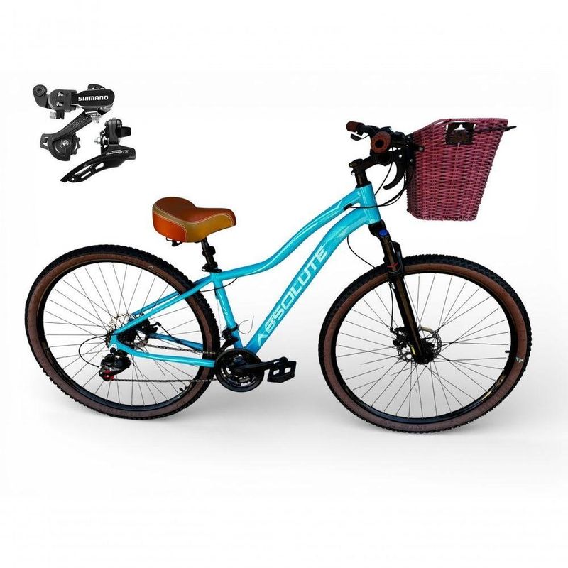 Bicicleta Aro 29 Feminina Absolute Hera Retrô Vintage 21v Shimano Selim Confortável Cesta Azul Tamano 15Uma bicicleta que desperta nostalgia à primeira vista, mas surpreende nos detalhes.Inspirada no estilo retrô/vintage, este modelo une o charme clássico com o que há de melhor na modernidade,entregando uma experiência de pedal extremamente confortável e prazerosa.Seu grande destaque é o conforto: selim largo com duas molas super macias,ideal para passeios longos, manoplas tipo couro agradáveis ao toque e uma cesta grande e prática,perfeita para o dia a dia. É a escolha ideal para quem busca estilo,conforto e funcionalidade em uma única bicicleta.Nova na caixa a pronta entrega, produto com ótima qualidade e acabamento, possui 21 marchas com sistema de alavancas rapid fire que a cada clique uma marcha é trocada, garfo com suspensão, sistema de freio a disco mecanico e cambios Shimano . Segue abaixo características da bike:Quadro Absolute Hera AlumínioGarfo 29 suspensão curso 60mmSuporte do guidão em alumínio pretoGuidão alto confort plus pretoCanote do selim 27.2mmSelim Super confort plus 2 molasManoplas couro confort plusAbraçadeira do Selim alumínio PretoAros Aero Parede dupla reforçadoRaios PretosCubos Pretos com blocagensPneus 29 Cravudinhos com faixaMovimento central selado rolamentadoFreios a disco mecanico com discos inox 160mmAlavancas Semi-automáticas Rapid FireCâmbio Traseiro Shimano TZCâmbio Dianteiro Shimano TZCorrente IndexPedivela Aço RevestidoPedal Plataforma Nylon pretoRoda Livre 7v index (rosca)Kit Pisca LED dianteiro/traseiroBicicleta pré montada, vai precisar apenas fixar a roda dianteira, guidão, selim e pedais. Recomendamos que seja feita uma revisão por um técnico após a recebimento do produto, para reajuste e regulagem, pois no transporte pode acontecer de alguma peça soltar ou desregularFotos meramente ilustrativas