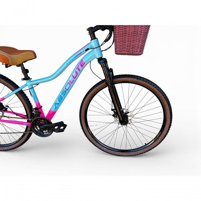 Bicicleta Aro 29 Feminina Absolute Hera Retrô Vintage Shimano 21v Hidráulica Confortável Cesta Azul/rosa Tamano 17Uma bicicleta que desperta nostalgia à primeira vista, mas surpreende nos detalhes.Inspirada no estilo retrô/vintage, este modelo une o charme clássico com o que há de melhor na modernidade,entregando uma experiência de pedal extremamente confortável e prazerosa.Seu grande destaque é o conforto: selim largo com duas molas super macias,ideal para passeios longos, manoplas tipo couro agradáveis ao toque e uma cesta grande e prática,perfeita para o dia a dia. É a escolha ideal para quem busca estilo,conforto e funcionalidade em uma única bicicleta.Nova na caixa a pronta entrega, produto com ótima qualidade e acabamento, possui 21 marchas com sistema de alavancas rapid fire que a cada clique uma marcha é trocada, garfo com suspensão, sistema de freio a disco Hidraulico e cambios Shimano . Segue abaixo características da bike:Quadro Absolute Hera AlumínioGarfo 29 suspensão curso 60mmSuporte do guidão em alumínio pretoGuidão alto confort plus pretoCanote do selim 27.2mmSelim Super confort plus 2 molasManoplas couro confort plusAbraçadeira do Selim alumínio PretoAros Aero Parede dupla reforçadoRaios PretosCubos Pretos com blocagensPneus 29 Cravudinhos com faixaMovimento central selado rolamentadoFreios a disco Hidraulico com discos inox 160mmAlavancas Semi-automáticas Rapid FireCâmbio Traseiro Shimano TZCâmbio Dianteiro Shimano TZCorrente IndexPedivela Aço RevestidoPedal Plataforma Nylon pretoRoda Livre 7v index (rosca)Kit Pisca LED dianteiro/traseiroBicicleta pré montada, vai precisar apenas fixar a roda dianteira, guidão, selim e pedais. Recomendamos que seja feita uma revisão por um técnico após a recebimento do produto, para reajuste e regulagem, pois no transporte pode acontecer de alguma peça soltar ou desregularFotos meramente ilustrativas