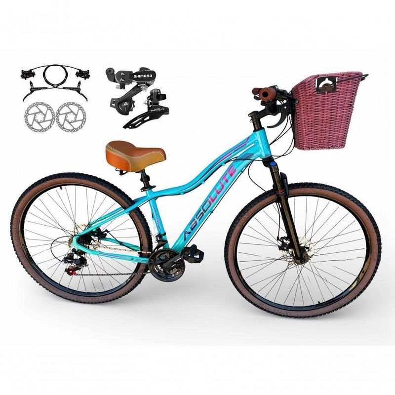 Bicicleta Aro 29 Feminina Absolute Hera Retrô Vintage Shimano 21v Hidráulica Confortável Cesta Azul/verde Tamano 17Uma bicicleta que desperta nostalgia à primeira vista, mas surpreende nos detalhes.Inspirada no estilo retrô/vintage, este modelo une o charme clássico com o que há de melhor na modernidade,entregando uma experiência de pedal extremamente confortável e prazerosa.Seu grande destaque é o conforto: selim largo com duas molas super macias,ideal para passeios longos, manoplas tipo couro agradáveis ao toque e uma cesta grande e prática,perfeita para o dia a dia. É a escolha ideal para quem busca estilo,conforto e funcionalidade em uma única bicicleta.Nova na caixa a pronta entrega, produto com ótima qualidade e acabamento, possui 21 marchas com sistema de alavancas rapid fire que a cada clique uma marcha é trocada, garfo com suspensão, sistema de freio a disco Hidraulico e cambios Shimano . Segue abaixo características da bike:Quadro Absolute Hera AlumínioGarfo 29 suspensão curso 60mmSuporte do guidão em alumínio pretoGuidão alto confort plus pretoCanote do selim 27.2mmSelim Super confort plus 2 molasManoplas couro confort plusAbraçadeira do Selim alumínio PretoAros Aero Parede dupla reforçadoRaios PretosCubos Pretos com blocagensPneus 29 Cravudinhos com faixaMovimento central selado rolamentadoFreios a disco Hidraulico com discos inox 160mmAlavancas Semi-automáticas Rapid FireCâmbio Traseiro Shimano TZCâmbio Dianteiro Shimano TZCorrente IndexPedivela Aço RevestidoPedal Plataforma Nylon pretoRoda Livre 7v index (rosca)Kit Pisca LED dianteiro/traseiroBicicleta pré montada, vai precisar apenas fixar a roda dianteira, guidão, selim e pedais. Recomendamos que seja feita uma revisão por um técnico após a recebimento do produto, para reajuste e regulagem, pois no transporte pode acontecer de alguma peça soltar ou desregularFotos meramente ilustrativas