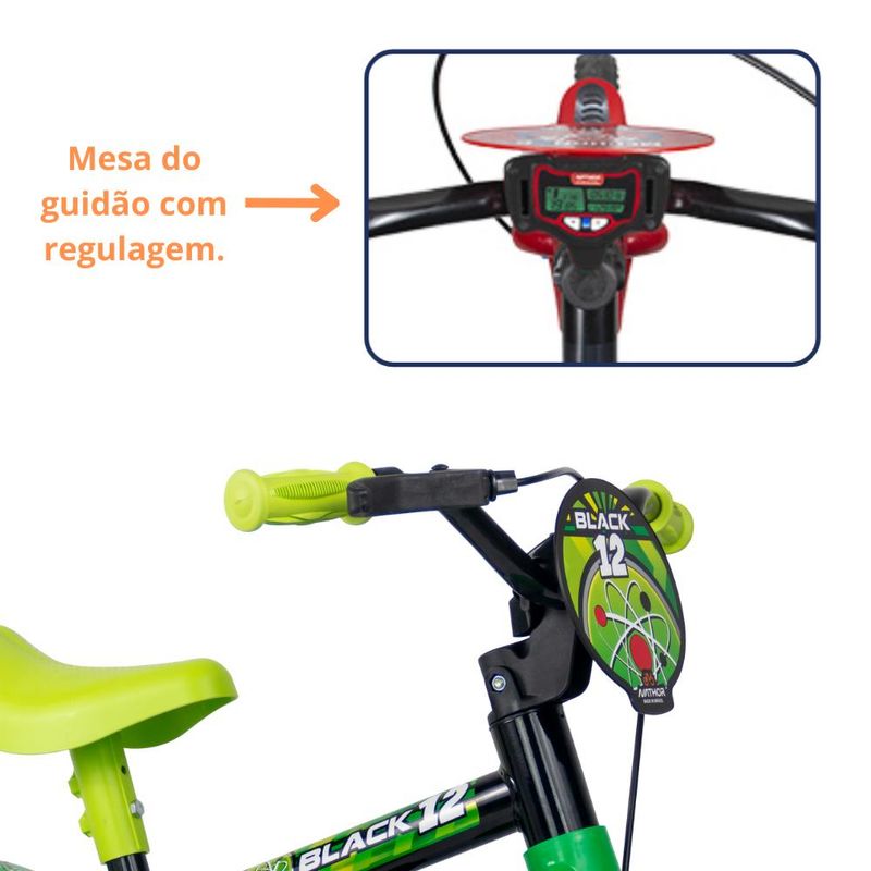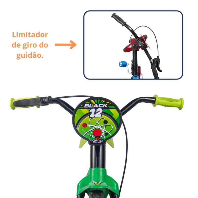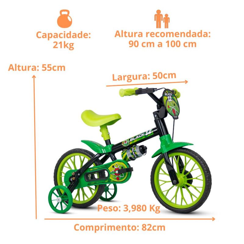 Bicicleta Infantil Criança Aro 12 Black 12 Nathor Resistência e segurança para começar a pedalar! As bicicletas aro 12” Nathor são equipadas com os melhores itens de segurança e conforto para crianças. Com o limitador de giro, a criança garante mais equilíbrio e segurança ao pedalar. A regulagem de ângulo do guidão e da altura do selim permitem que a postura do ciclista se mantenha correta, além de possibilitar que a bicicleta seja usada por mais tempo – acompanhando o crescimento. O movimento central avançado facilita o pedalar, estimulando o aprendizado. Descrição do produto Marca: Nathor Peso: 3,98 kg Aro: 12 Peso máximo: 21 kg Dimensões do produto: 82 x 55 x 50 (C x L x A) Altura recomendada: 90 a 100 cm Idade recomendada: 3 anos Imagens meramente ilustrativas, todos os itens que ambientam o produto não estão inclusos.