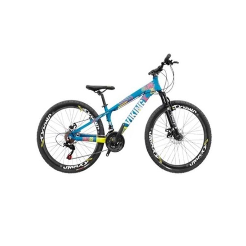 Bicicleta Viking Aro 26 Câmbio Importado 21v Vmaxx Azul Amarelo- Foto Meramente Ilustrativa- Marca: VikingX- Quadro Alumínio- Idade recomendada: Juvenil/Adulto- Gênero: Unissex- Aro: 26- Velocidades 21 Marchas- Garfo: Suspensão Mecânica- Guidão: Aço carbono Mtb- Freios: Disco Mecânico- Rodas: Vmaxx- Câmbios: Importados- Manoplas: Mtb Simples- Corrente: Index- Selim: Mtb Simples- Trocador: Rapid fire importado- Pedivela: Importado- Pneus: Mtb com cravo Balão- Pedal: Plástico Mtb- Modelo da bicicleta: MtbOBSERVAÇÕESPode haver alguma diferença de tonalidade entre a imagem e o produto real, por conta do tratamento de imagens e a calibração de cores do monitor.MONTAGEMEnviamos a bicicleta pré-montada, revisada e devidamente embalada, para melhor se acomodar na embalagem de transporte são retirados apenas: selim, pedais, guidão e roda dianteira.O custo da montagem é de responsabilidade do cliente.Por motivo de transporte e manuseio, é necessário efetuar uma nova regulagem de câmbio ao receber o produto.Garantia: 3 mesesLargura: 23Comprimento: 1,48Altura: 76Tamanho do Quadro: 13