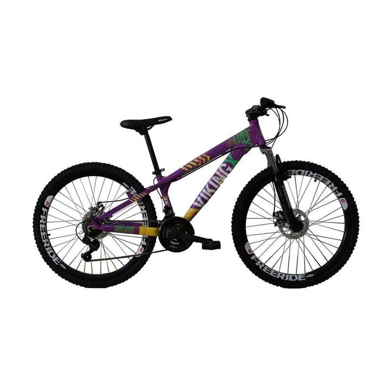 Bicicleta Viking X Tuff25 Freeride Aro 26 Freio A DiscoBicicleta Viking X TUFF25 Freeride Aro 26 Freio a Disco 21 Velocidades Cambios Shimano Lilás Amarelo - Vikingx ; Foi projetada para quem quer uma bike de personalidade e estilo inigualável. Ela oferece ao ciclista quadro diferenciado e design arrojado e exclusivo. Com qualidade, ela vem equipada de com 21 velocidades, permitindo ao ciclista a escolha da marcha ideal de acordo com o local. O design moderno pode ser observado no quadro da bike e os pneus são confeccionados em MTB com aro 26, garantindo segurança total a cada manobra em qualquer tipo de terreno. A Bicicleta vem regulada, ficando por conta do comprador apenas ajuste de canote/selim/guidão e inserção da roda dianteira, em caso de dúvida aconselhamos a procura por pessoa especializada para a montagem, caso isto ocorra, fica por conta do comprador a referida montagem. Informações técnicas: - Marca: Viking - Coleção / Sortimento: 2017 - Idade recomendada: Juvenil/Adulto - Gênero: Unissex - Aro: 26 - Quadro: Aluminio - Marcha: 21 Marchas - Garfo: Suspensão - Guidão: Aço carbono MTB - Freios: Disco - Rodas: Freeride - Cambios: Shimano - Manoplas: MTB - Corrente: Index - Selim: MTB Preto - Trocador de marcha: Rapid fire - Pedivela: Importado - Pneus: MTB 26" - Pedal: Plástico MTB - Dimensões 1,20x0,70x25 - Peso 15,9kg Conteúdo da Embalagem: 1 Bicicleta, manual de Instruções Garantia do Fornecedor: 3 Meses Modelo: MTB Freeride ;