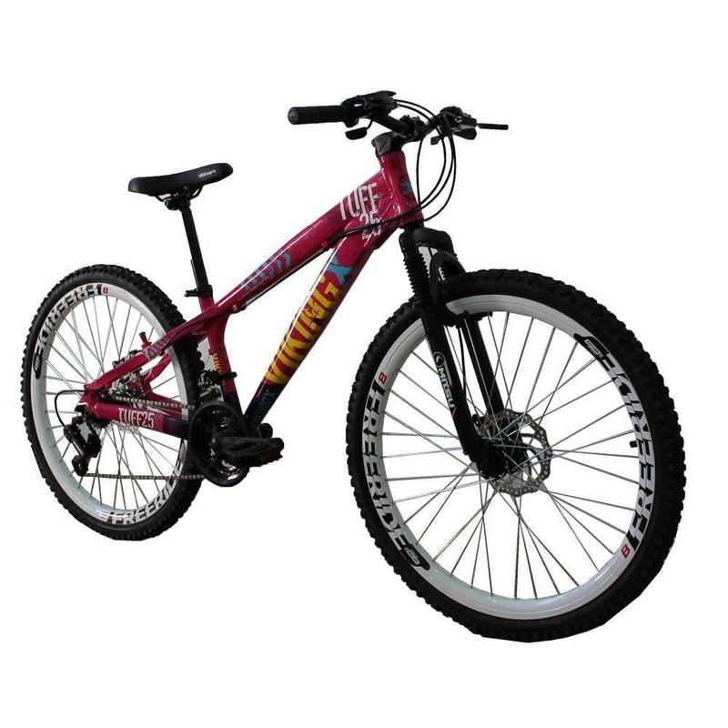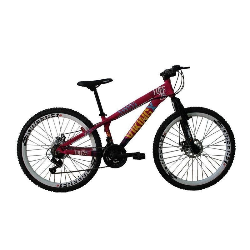 Bicicleta Viking X TUFF25 Freeride Aro 26 Freio a Disco 21 Velocidades Cambio Shimano Traseiro e Importado Dianteiro Rosa Roxo - Vikingx Foi projetada para quem quer uma bike de personalidade e estilo inigualável. Ela oferece ao ciclista quadro diferenciado e design arrojado e exclusivo. Com qualidade, ela vem equipada de com 21 velocidades, permitindo ao ciclista a escolha da marcha ideal de acordo com o local. O design moderno pode ser observado no quadro da bike e os pneus são confeccionados em MTB com aro 26, garantindo segurança total a cada manobra em qualquer tipo de terreno.A Bicicleta vem regulada, ficando por conta do comprador apenas ajuste de canote/selim/guidão e inserção da roda dianteira, em caso de dúvida aconselhamos a procura por pessoa especializada para a montagem, caso isto ocorra, fica por conta do comprador a referida montagem.Informações técnicas:- Marca: Viking- Coleção / Sortimento: 2017- Idade recomendada: Juvenil/Adulto- Gênero: Unissex- Aro: 26- Quadro: Aluminio- Marcha: 21 Marchas- Garfo: Suspensão- Guidão: Aço carbono MTB- Freios: Disco- Rodas: Freeride- Cambios: Shimano- Manoplas: MTB- Corrente: Index- Selim: MTB Preto- Trocador de marcha: Rapid fire- Pedivela: Importado- Pneus: MTB 26"- Pedal: Plástico MTB- Dimensões 1,20x0,70x25- Peso 15,9kgConteúdo da Embalagem: 1 Bicicleta, manual de InstruçõesGarantia do Fornecedor: 3 MesesModelo: MTB Freeride