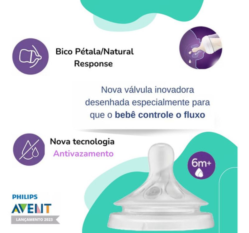 Tenha tranquilidade de comprar com quem está disposto a te oferecer o melhor atendimento. A Feccomerce tem a missão de garantir a satisfação total do seu cliente, tanto nos produtos quanto no atendimento. Assim estabelecendo uma relação de confiança e satisfação. Nossos produtos são 100% originais, lacrados como vem do fabricante._______________________________________ Fiz a compra, o que irei receber? 1 Bico Philips Avent Pétala 3.0 T5 Antivazamento 6m+. ________________________________________ BICO MAMADEIRA PETALA 3.0 T6 6M+/SCY966/02Bico Natural Response que possui a válvula desenhada especialmente para que o bebê controle o fluxo. Única válvula capaz de interromper totalmente o fluxo quando o bebê para de sugar.Nova válvula inovadoraO bico Natural Response funciona com o fluxo e ritmo individualizado para cada bebê.Bico Anti-gotejamentoA abertura do bico foi desenhada para liberar leite apenas quando ativada.Bico flexível e macio.Feito em silicone isento de odor e sabor.Permite o desenvolvimento correto da dentição, palato e gengivas. _____________________________________________________ Produto Isento de Registro, conforme Resolução Nº10, de 21/10/1999, da ANVISA. Produto de acordo com NBR 13.793. Inmetro: OCP 0040 Compulsório. O Ministério da Saúde Adverte: A criança que mama no peito não necessita de mamadeira, bico ou chupeta. O uso de mamadeira, bico ou chupeta prejudica a amamentação e seu uso prolongado, prejudica a dentição e a fala da criança.