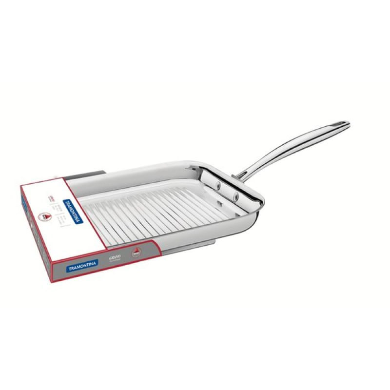 Bistequeira Tramontina Grano 22cm 1,2L Aço Inox Tramontina - Com a bistequeira Tramontina Grano em aço inox ficou muito mais fácil e prático preparar aquele peixe ou bife grelhado para seu almoço. Ideal para uso diário, ela lhe garante resistência e durabilidade, pois conta com corpo totalmente produzido em aço inox, matéria-prima que não solta nenhum resíduo nos alimentos, mantendo-os saudáveis. A bistequeira conta com corpo triplo, característica que proporciona um cozimento rápido e uniforme dos alimentos. Ela pode ser ser utilizada em fogões à gás, elétricos, vitrocerâmicos e indução, além de poder ir ao forno para gratinar ou finalizar pratos na temperatura máxima de 260°C. Além de todas essas características, ela é muito fácil de limpar e pode ser lavada diariamente na máquina de lavar louças. Uma bistequeira com design diferenciado, moderno e com acabamento em alto brilho que deixa sua cozinha muito mais bonita e cheia de estilo! Características Gerais do Produto: Garantia: • 90 dias de garantia legal para defeitos de fabricação