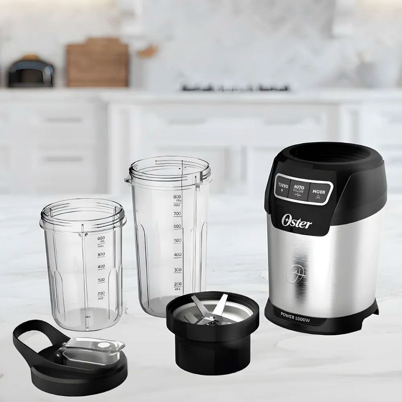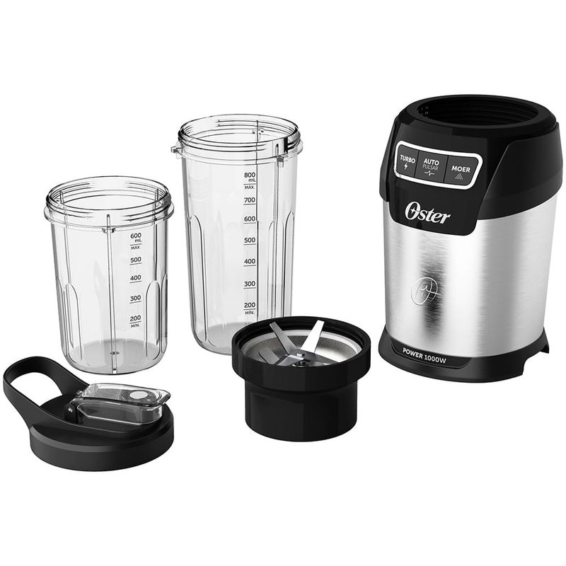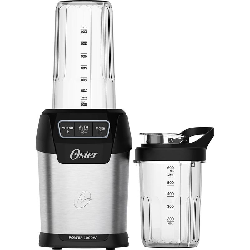 Blender Ultra Power 1000 Oster com 2 Copos com 1000W de potência e 6 lâminas de precisão projetadas para extrair o máximo de sabor e textura, o Personal Blender Oster® é a escolha definitiva para levar suas receitas a outro nível. Acompanhado de dois copos, nosso blender permite que você leve seus preparos para onde quer que vá, garantindo sabor e nutrição onde você estiver. Destaques Ultra potenteSão 1000W de potência com 6 lâminas de inox, combinados aos copos que foram especialmente projetados para potencializar os resultados. A eficiência deste conjunto oferece a você o máximo de eficiência para micronizar até os alimentos mais rígidos. O Personal Blender Oster®É Perfeito ParaPrepare bebidas nutritivas e deliciosas em poucos minutos. Texturas perfeitas para acompanhar suas refeições. Triture e crie suas próprias farinhas e misturas de grãos. Fácil De Usar E Com PrecisãoNa Extração De NutrientesA combinação das lâminas com o design dos copos também garante uma extração ideal de nutrientes. Com apenas 3 botões, você ajusta a consistência das suas receitas. Liquidifica os alimentos em velocidade máxima ininterruptamente. Ideal para preparar sucos, vitaminas e smoothies. Velocidade máxima | Ritmo contínuo | 60s. Microniza alimentos mais rígidos com pulsos automáticos. Ideal para preparar receitas utilizando ingredientes crus, mais rígidos e congelados. Velocidade máxima | Ritmo pulsado | 60s. Mói grãos com pulsos automáticos em velocidade menor. Ideal para preparar cremes e pastas mais densas, e para moer grãos em pó. Velocidade alta | Ritmo pulsado | 30s. Dois Copos E TampaO Personal Blender OSTER® vem com dois copos portáteis super-resistentes, de 800ml e 600ml, e uma tampa, para que você possa levar suas bebidas favoritas para qualquer lugar. Aproveite suas criações onde e quando quiser! Facil De LimparO conjunto desmontável facilita a limpeza, garantindo mais praticidade para o seu dia a dia. Design InteligenteA base com ventosa proporciona maior estabilidade durante o uso. Os detalhes em aço inox adicionam um toque de sofisticação à sua cozinha. CaracterísticasFunções: Ideal para preparar sucos, vitaminas e smoothiesVelocidades: 03Capacidade do Copo: 0,6 Litros / 0,8 LitrosLâminas de Inox: 06Base com Ventosa Especificações TécnicasModelo: OSOBLD100Potência: 1000WVoltagem: 110V / 220V (não é bivolt)Cor: Preto e InoxEAN: 7898742841103 (110V) / 7898742841110 (220V)Garantia: 12 meses Dimensões e PesoDimensões do produto sem embalagem (AxLxP): 370x140x140 mmDimensões do produto com embalagem (AxLxP): 245x380x170 mmPeso do produto sem embalagem: 2,61 KgPeso do produto com embalagem: 3,11 Kg Itens Inclusos01 Blender Ultra Power 1000