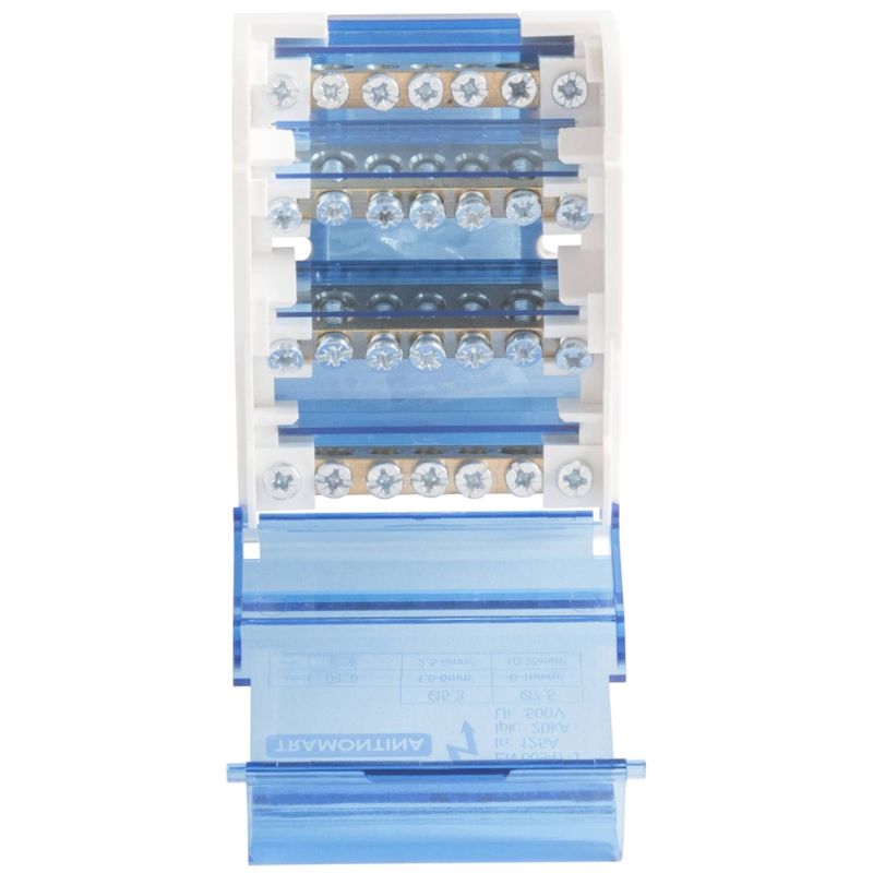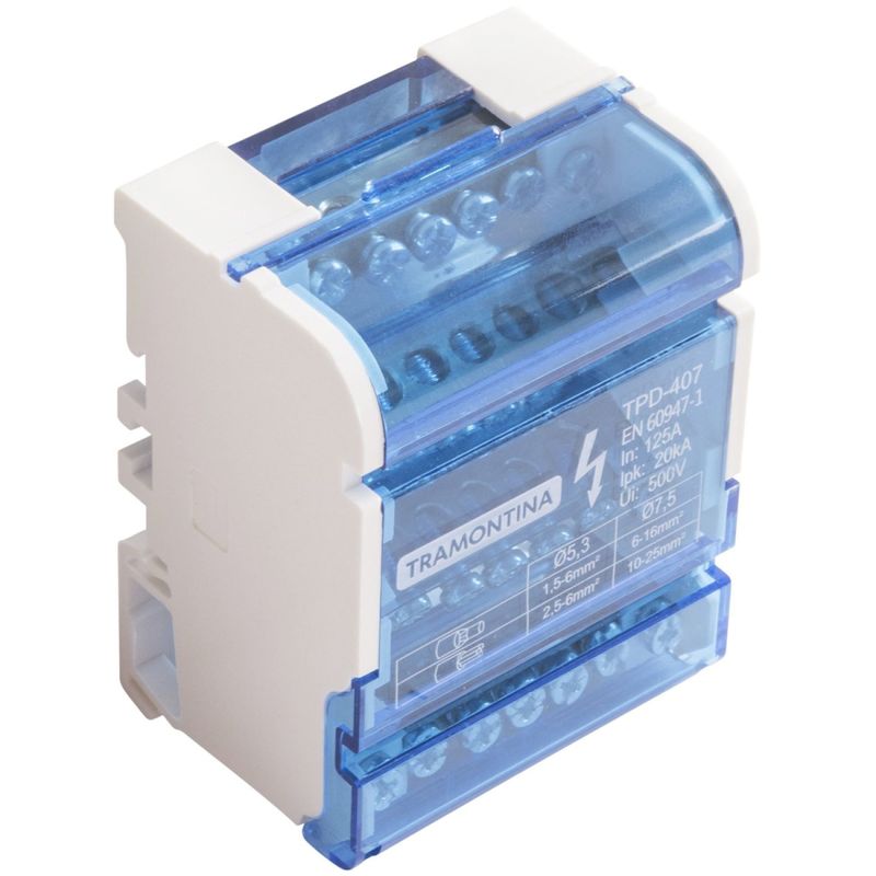 Bloco de distribuição 125A 4 Pólos 7 conexões Tramontina - Bloco de distribuição 125A 4 Pólos 7 conexões O bloco de distribuição Tramontina 125A 4 pólos com 7 conexões foi desenvolvido para distribuir energia de maneira eficiente e organizada em quadros elétricos que exigem múltiplas seções de cabos. Com quatro polos e capacidade para até 125A, ele é fabricado em termoplástico retardante de chamas, garantindo segurança e resistência. As sete conexões proporcionam facilidade na junção dos circuitos de alimentação, e sua instalação prática em trilho DIN simplifica a montagem e manutenção. 125A 4 Polos con 7 Conexiones. Cuidados com o produto à importante que o produto seja instalado por um profissional qualificado. Desligar a energia elétrica antes de fazer a instalação. Garantia 1 ano e 06 meses (90 dias de garantia legal acrescidos de 01 ano e 03 meses de garantia contratual) para vÃcios ou defeitos de fabricação. - - Características Gerais do Produto: Garantia: • 1 Ano