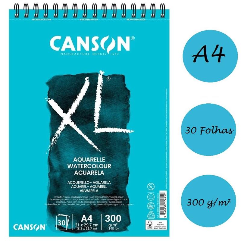 Bloco XL Aquarelle A4 Branco com 30 Folhas 300g - Canson A linha XL da Canson foi especificamente desenvolvida para satisfazer as necessidades dos estudantes de Belas Artes, oferecendo uma grande variedade de papéis e permitindo ao estudante experimentar diferentes texturas e gramaturas em função dos seus gostos e das técnicas que utilizam. XL® Aquarelle é um papel especialmente desenvolvido para técnicas úmidas, incluindo a aquarela, é muito fácil de corrigir com uma esponja ou um pincel. Ideal para: Aquarela Características: - Tamanho: A4 (210mm x 297mm) - Gramatura: 300 g/m² - Folhas: 30- Grão fino- Acabamento: Espiral- Certificação FSC® - Livre de ácido - Não tem quaisquer aditivos ópticos branqueadores - Possui tratamento anti-fungos - Está em conformidade com a norma ISO 9706. Embalagem com 01 unidade Imagens meramente ilustrativas, as cores podem variar em cada tela ou monitor.
