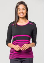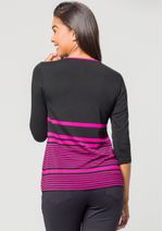 Blusa mangas 3/4 e decote redondo. Listrada em Preto e Fúcsia. Decote com acabamento em viés na cor mostarda. Peça versátil, confortável e despojada! Permita-se! Composição da malha: Confeccionado em 95% Viscose e 5% Elastano. Construído em Viscolycra. Medidas Aproximadas: P: 62cm Comprimento x 92cm Busto x 98cm Cintura x 108cm Quadril. M: 64cm Comprimento x 98cm Busto x 104cm Cintura x 114cm Quadril. G: 66cm Comprimento x 104cm Busto x 110cm Cintura x 120cm Quadril. GG: 68cm Comprimento x 110cm Busto x 116cm Cintura x 126cm Quadril. XL: 70cm Comprimento x 116cm Busto x 122cm Cintura x 132cm Quadril. Todos os dados informados são aproximados, do peso às medidas. ATENÇÃO PARA AS MEDIDAS. MODELAGEM AMPLA.