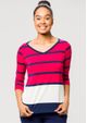 Blusa decote em "V" e mangas 3/4. Listrada nos tons de Off White, Azul Marinho e Vermelho. Acabamento do decote em malha lisa na cor Azul Marinho. Moderna e confortável. Arrase! Composição da malha: Confeccionado em 95% Viscose e 5% Elastano. Toque macio. Medidas Aproximadas: P: 62cm Comprimento x 92cm Busto x 92cm Cintura x 100cm Quadril. M: 64cm Comprimento x 98cm Busto x 98cm Cintura x 106cm Quadril. G: 66cm Comprimento x 104cm Busto x 104cm Cintura x 112cm Quadril. GG: 68cm Comprimento x 110cm Busto x 110cm Cintura x 118cm Quadril. XL: 70cm Comprimento x 116cm Busto x 116cm Cintura x 124cm Quadril. Todos os dados informados são aproximados, do peso às medidas. ATENÇÃO PARA AS MEDIDAS. MODELAGEM AMPLA.