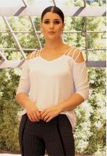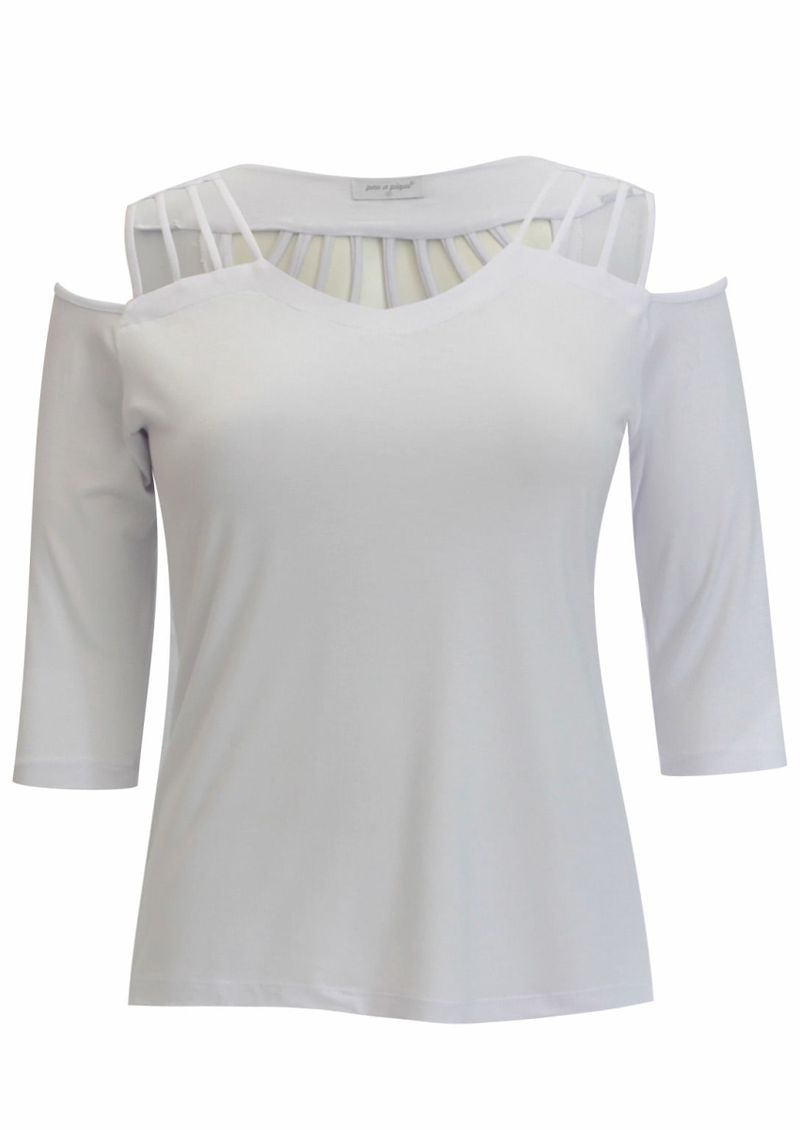 Blusa com decote em "V". Malha da blusa básica, na cor Branco. Mangas modelo ¾, com abertura e detalhe de tiras nos ombros e costas. Elegante, confortável e despojada!!! Permita-se! Composição da malha: Confeccionado em 96% Viscose e 4% Elastano. Construído em "Viscolycra", com toque macio. Medidas Aproximadas: PP: 61 x 90 x 90 x 102 cm (Altura, Busto, Cintura e Quadril). P: 63 x 96 x 96 x 108 cm (A, B, C, Q). M: 65 x 102 x 102 x 114 cm (A, B, C, Q). G: 67 x 108 x 108 x 120 cm (A, B, C, Q). GG: 69 x 114 x 114 x 126 cm (A, B, C, Q). XL: 71 x 120 x 120 x 132 cm (A, B, C, Q). Todos os dados informados são aproximados, do peso às medidas. Atenção para as medidas, pois nossa modelagem é AMPLA.