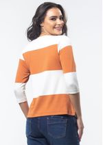 Blusa decote redondo e mangas 3/4. Malha listrada nas cores Laranja e Off White. Moderna e confortável compõem diversos looks despojados. Arrase! Composição da malha: Confeccionado em 95% Viscose e 5% Elastano. Construída em "Viscocrepe". Medidas Aproximadas: P: 61 x 94 x 96 x 102 cm (Comprimento, Busto, Cintura e Quadril). M: 63 x 100 x 102 x 108 cm (Comprimento, Busto, Cintura e Quadril). G: 65 x 106 x 108 x 114 cm (Comprimento, Busto, Cintura e Quadril). GG: 67 x 112 x 114 x 120 cm (Comprimento, Busto, Cintura e Quadril). XL: 69 x 118 x 120 x 126 cm (Comprimento, Busto, Cintura e Quadril). Todos os dados informados são aproximados, do peso às medidas. ATENÇÃO PARA AS MEDIDAS. MODELAGEM AMPLA.