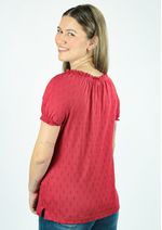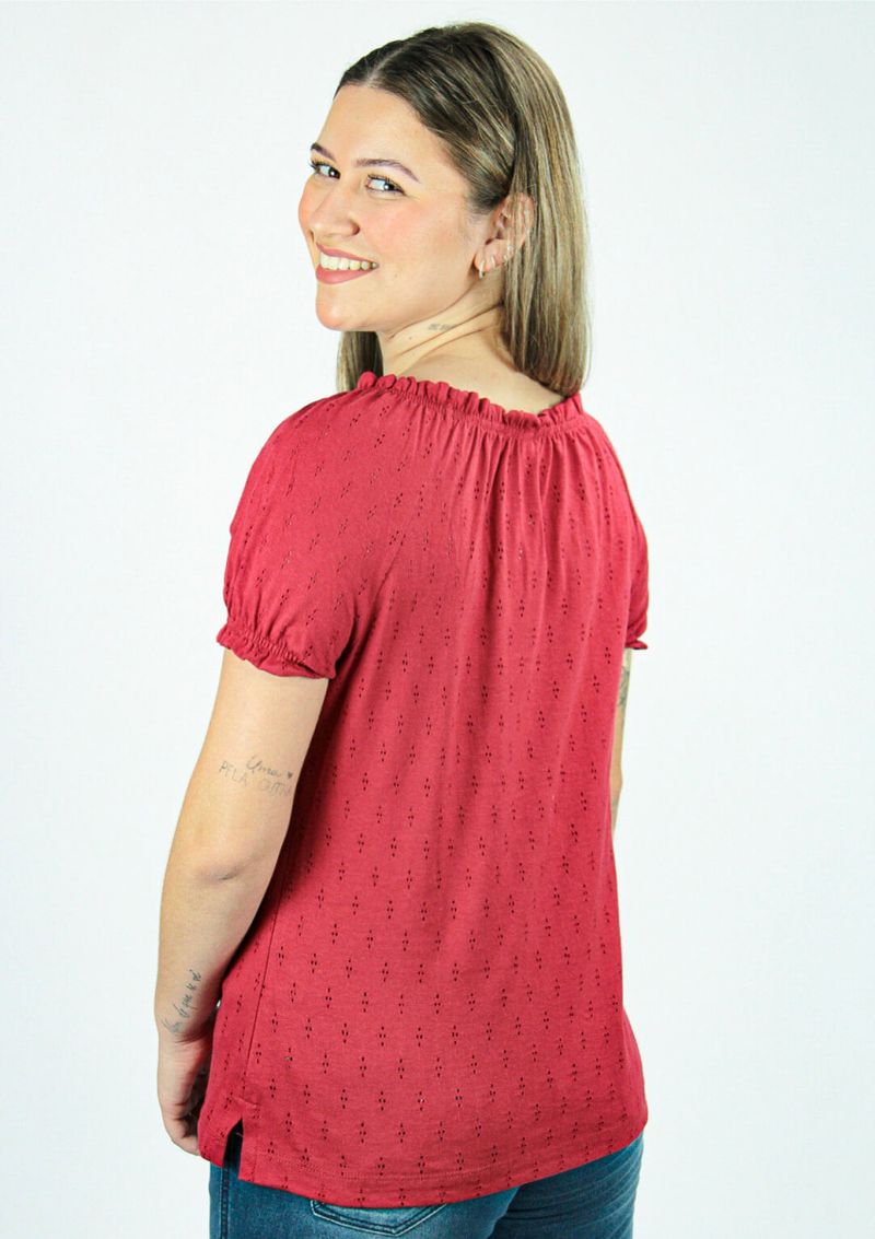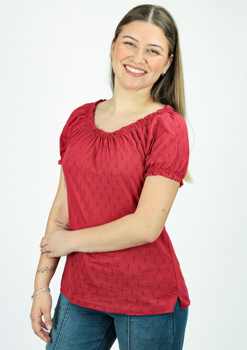 Blusa Ciganinha de Laise em Algodão na cor vermelho- Conforto e Estilo Transforme seu visual com a nossa blusa ciganinha de decote canoa, perfeita para compor looks despojados e modernos. Confeccionada em 100% algodão de laise, esta peça é caracterizada por pequenos "furinhos" que proporcionam leveza e sofisticação. A modelagem soltinha garante um caimento confortável, ideal para qualquer ocasião. Modelagem: Solta ao corpo, oferecendo liberdade de movimento Composição: 100% Algodão Toque: Super macio e agradável na pele Medidas Aproximadas: Tamanho P: 62 cm (Comprimento) x 94 cm (Busto) x 96 cm (Cintura) x 102 cm (Quadril) Tamanho M: 64 cm (Comprimento) x 100 cm (Busto) x 102 cm (Cintura) x 108 cm (Quadril) Tamanho G: 66 cm (Comprimento) x 106 cm (Busto) x 108 cm (Cintura) x 114 cm (Quadril) Tamanho GG: 68 cm (Comprimento) x 112 cm (Busto) x 114 cm (Cintura) x 120 cm (Quadril) Tamanho XL: 70 cm (Comprimento) x 118 cm (Busto) x 120 cm (Cintura) x 126 cm (Quadril) ATENÇÃO: Nossas medidas são aproximadas e a modelagem é ampla. Recomendamos verificar as dimensões antes de efetuar a compra. • Modelo está usando o tamanho P.