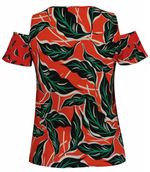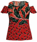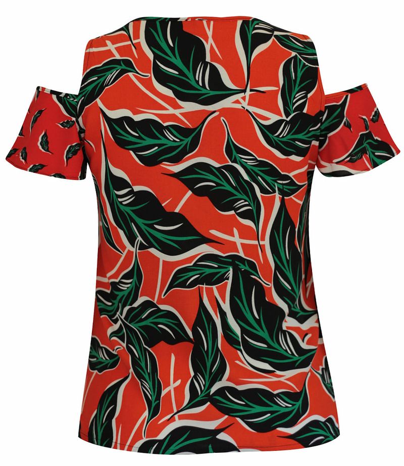 Blusa com decote redondo e mangas curtas, compostas por abertura. Malha da blusa estampada em tons de laranja, verde e vermelho. Moderna e confortável compõem diversos looks despojados. Arrase! Composição da malha: Confeccionado em 100% Viscose. Toque macio. Sem Elasticidade. Medidas Aproximadas: P: 61 x 94 x 94 x 100 cm (Altura, Busto, Cintura e Quadril). M: 63 x 100 x 100 x 106 cm (A, B, C, Q). G: 65 x 106 x 106 x 112 cm (A, B, C, Q). GG: 67 x 112 x 112 x 118 cm (A, B, C, Q). XL: 69 x 118 x 118 x 124 cm (A, B, C, Q). Todos os dados informados são aproximados, do peso às medidas. ATENÇÃO PARA AS MEDIDAS, POIS NOSSA MODELAGEM É AMPLA.