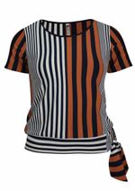 Blusa Listrada com decote redondo em tons de Marinho, Telha e Off White. Possui detalhe de amarração lateral-frontal. Modelagem da blusa, soltinha ao corpo. Confortável, elegante e linda. Permita-se! Composição da malha: Confeccionado em 95% Viscose e 5% Elastano. Construída em "Viscolycra" com toque macio. Medidas Aproximadas: P: 55 x 90 x 90 x 92 cm (Altura, Busto, Cintura e Quadril). M: 57 x 96 x 96 x 98 cm (Altura, Busto, Cintura e Quadril). G: 59 x 102 x 102 x 104 cm (Altura, Busto, Cintura e Quadril). GG: 61 x 108 x 108 x 110 cm (Altura, Busto, Cintura e Quadril). XL: 63 x 114 x 114 x 116 cm (Altura, Busto, Cintura e Quadril). Todos os dados informados são aproximados, do peso às medidas. ATENÇÃO PARA AS MEDIDAS POIS NOSSA MODELAGEM É AMPLA!