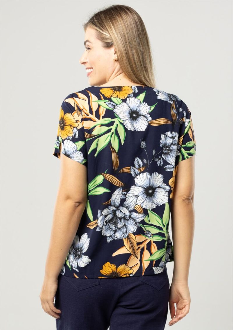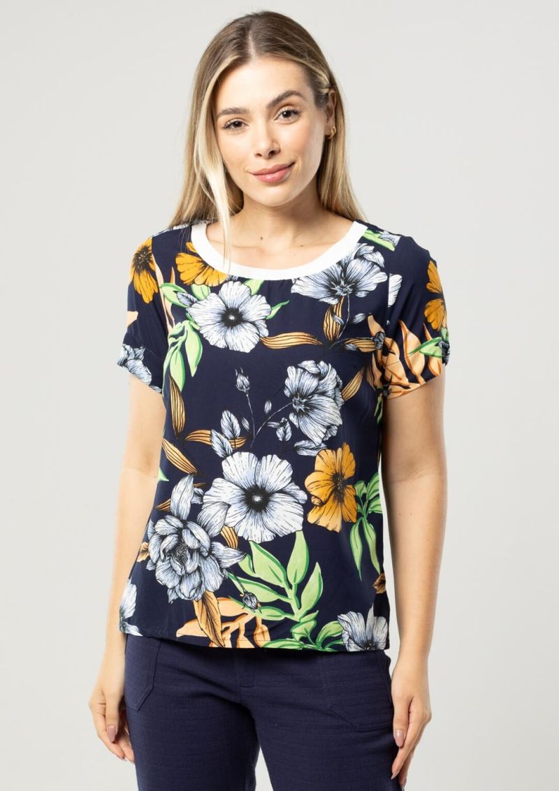 Blusa feminina com estampa floral sobre o fundo Azul Marinho. Mangas curtas e decote redondo com acabamento em retilínea Branca. Construída em Viscose uma fibra artificial de celulose, fabricada a partir de cavacos de madeira. Tecido leve, fresquinho, confortável e que transpira, ou seja, não retém calor. Te deixa pronta para encarar todos os desafios com elegância e feminilidade. Aproveite! Composição da malha: Confeccionado em 100% Viscose . Toque macio. Sem Elasticidade. Medidas Aproximadas: P: 59cm Comprimento x 102cm Busto x 98cm Cintura x 104cm Quadril. M: 61cm Comprimento x 108cm Busto x 104cm Cintura x 110cm Quadril. G: 63cm Comprimento x 114cm Busto x 110cm Cintura x 116cm Quadril. GG: 65cm Comprimento x 120cm Busto x 116cm Cintura x 122cm Quadril. XL: 67cm Comprimento x 126cm Busto x 122cm Cintura x 128cm Quadril. Todos os dados informados são aproximados, do peso às medidas. ATENÇÃO PARA AS MEDIDAS. MODELAGEM AMPLA. *Modelo está usando o tamanho P*
