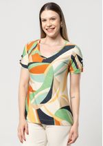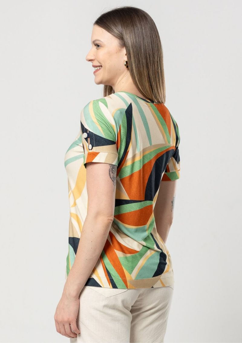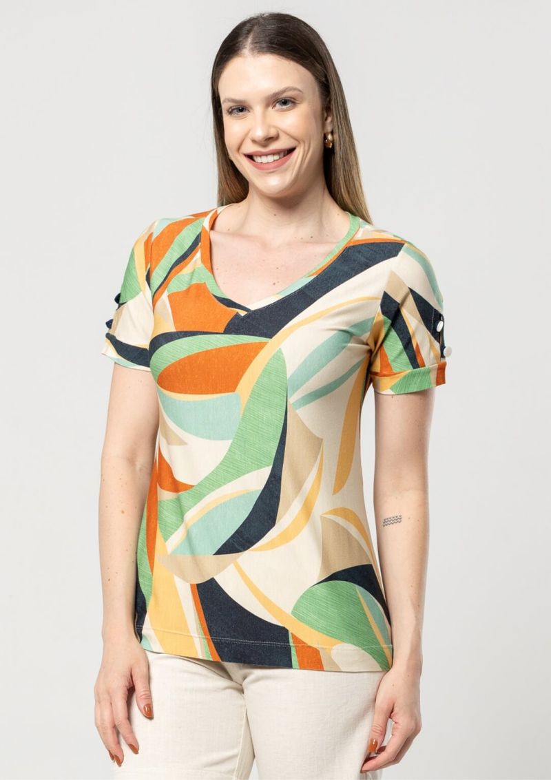 Blusa feminina com decote em "V" e mangas curtas. Peça estampada em tons radiantes. Mangas com punho no mesmo tecido da peça, abertura e fechamento por botões. Confeccionada em viscolycra - tecido super leve, confortável e com alta elasticidade. Modelo para compor looks variados. Permita-se!!! Composição da malha: Confeccionado em 96% Viscose e 4% Elastano. Medidas Aproximadas: P: 62cm Comprimento x 92cm Busto x 90cm Cintura x 100cm Quadril. M: 64cm Comprimento x 98cm Busto x 96cm Cintura x 106cm Quadril. G: 66cm Comprimento x 104cm Busto x 102cm Cintura x 112cm Quadril. GG: 68cm Comprimento x 110cm Busto x 108cm Cintura x 118cm Quadril. XL: 70cm Comprimento x 116cm Busto x 114cm Cintura x 124cm Quadril. Todos os dados informados são aproximados, do peso às medidas. ATENÇÃO PARA AS MEDIDAS. MODELAGEM AMPLA.