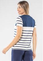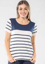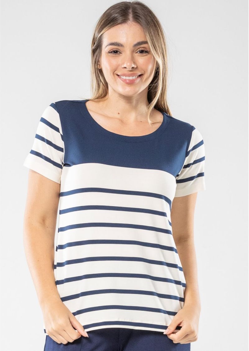 Blusa mangas curtas e decote redondo. Listrada em Azul Marinho e Off White. A clássica e versátil blusa listrada sempre será um sucesso. Aproveite! Composição da malha: Confeccionado em 92% Viscose e 8% Elastano. Medidas Aproximadas: P: 62cm Comprimento x 92cm Busto x 92cm Cintura x 102cm Quadril. M: 64cm Comprimento x 98cm Busto x 98cm Cintura x 108cm Quadril. G: 66cm Comprimento x 104cm Busto x 104cm Cintura x 114cm Quadril. GG: 68cm Comprimento x 110cm Busto x 110cm Cintura x 120cm Quadril. XL: 70cm Comprimento x 116cm Busto x 116cm Cintura x 126cm Quadril. Todos os dados informados são aproximados, do peso às medidas. ATENÇÃO PARA AS MEDIDAS. MODELAGEM AMPLA. *Modelo está usando o tamanho P*