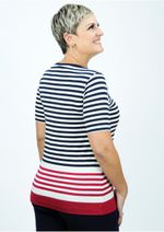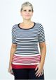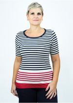 Blusa mangas curtas e decote redondo. Listrada em Azul Marinho, Vermelho e Off White. Esse modelo com listras reflete harmonia entre conforto e estilo. Aproveite!!! Composição da malha: Confeccionado em 92% Viscose e 8% Elastano. Medidas Aproximadas: P: 63cm Comprimento x 90cm Busto x 92cm Cintura x 104cm Quadril. M: 65cm Comprimento x 96cm Busto x 98cm Cintura x 110cm Quadril. G: 67cm Comprimento x 102cm Busto x 104cm Cintura x 116cm Quadril. GG: 69cm Comprimento x 108cm Busto x 110cm Cintura x 122cm Quadril. XL: 71cm Comprimento x 114cm Busto x 116cm Cintura x 128cm Quadril. Todos os dados informados são aproximados, do peso às medidas. ATENÇÃO PARA AS MEDIDAS. MODELAGEM AMPLA. *Modelo está usando o tamanho P*