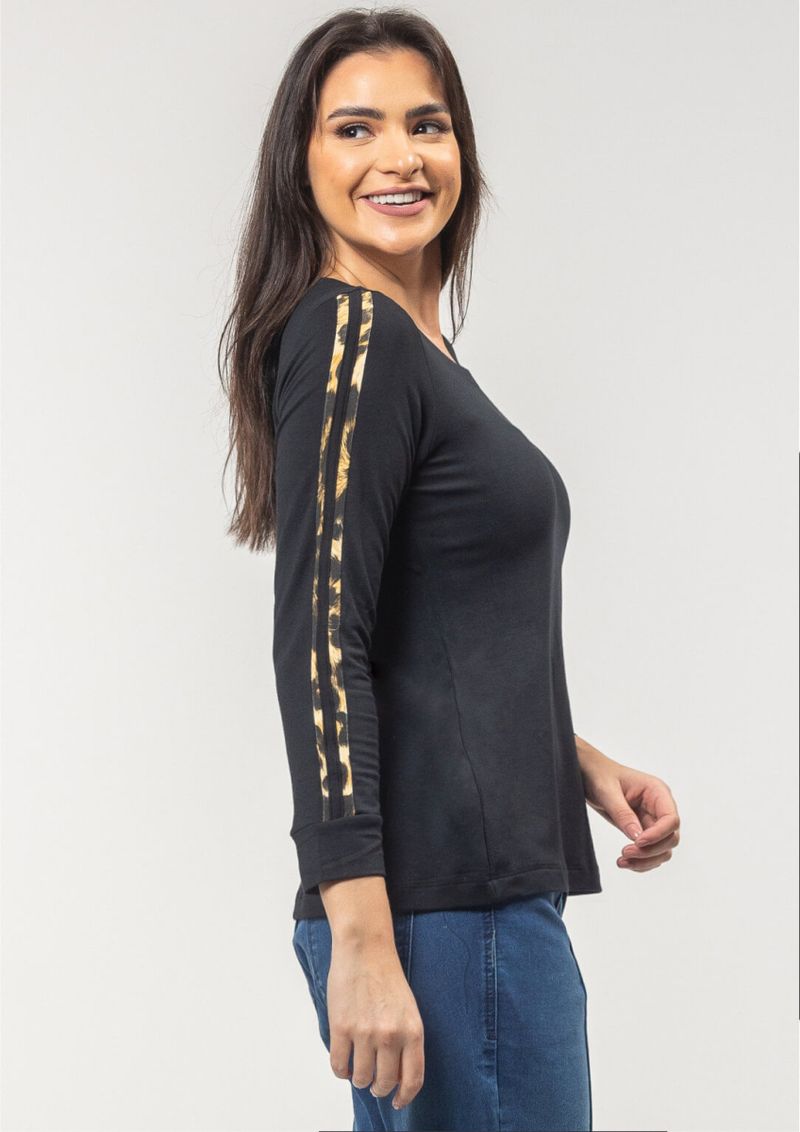 Blusa em malha lisa -Preto, mangas longas e decote redondo. Mangas com recorte em Animal Print e punho. Elegante, confortável e despojada!!! Permita-se! Composição da malha: Confeccionada em 97% Viscose e 3% Elastano. Construído em "Moletinho", com toque macio. Medidas Aproximadas: P: 61cm Comprimento x 90cm Busto x 88cm Cintura x 100cm Quadril. M: 63cm Comprimento x 96cm Busto x 94cm Cintura x 106cm Quadril. G: 65cm Comprimento x 102cm Busto x 100cm Cintura x 112cm Quadril. GG: 67cm Comprimento x 108cm Busto x 106cm Cintura x 118cm Quadril. XL: 69cm Comprimento x 114cm Busto x 112cm Cintura x 124cm Quadril. Todos os dados informados são aproximados, do peso às medidas. ATENÇÃO PARA AS MEDIDAS, POIS NOSSA MODELAGEM É AMPLA!