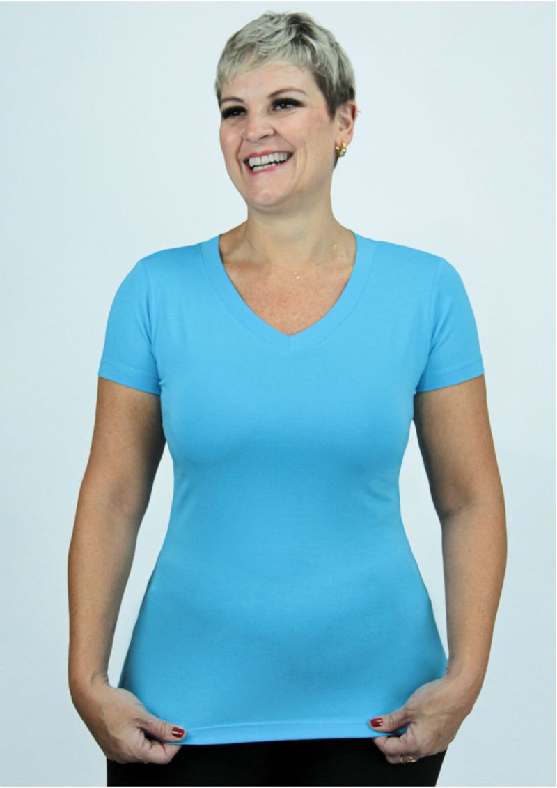 Blusa feminina construída em Viscolycra, na cor Azul Claro. Malha leve, confortável, ótima elasticidade e caimento incrível. Mangas curtas e decote em "V". Básica e moderna, compõe diversos looks despojados! Composição da malha: Confeccionado em 96% Viscose e 4% Elastano. Medidas Aproximadas: P: 61cm Comprimento x 84cm Busto x 80cm Cintura x 94cm Quadril. M: 63cm Comprimento x 90cm Busto x 86cm Cintura x 100cm Quadril. G: 65cm Comprimento x 96cm Busto x 92cm Cintura x 106cm Quadril. GG: 67cm Comprimento x 102cm Busto x 98cm Cintura x 112cm Quadril. XL: 69cm Comprimento x 108cm Busto x 104cm Cintura x 118cm Quadril. Todos os dados informados são aproximados, do peso às medidas. ATENÇÃO: Para as medidas, pois nossa modelagem é ampla! *Modelo está usando o tamanho P*