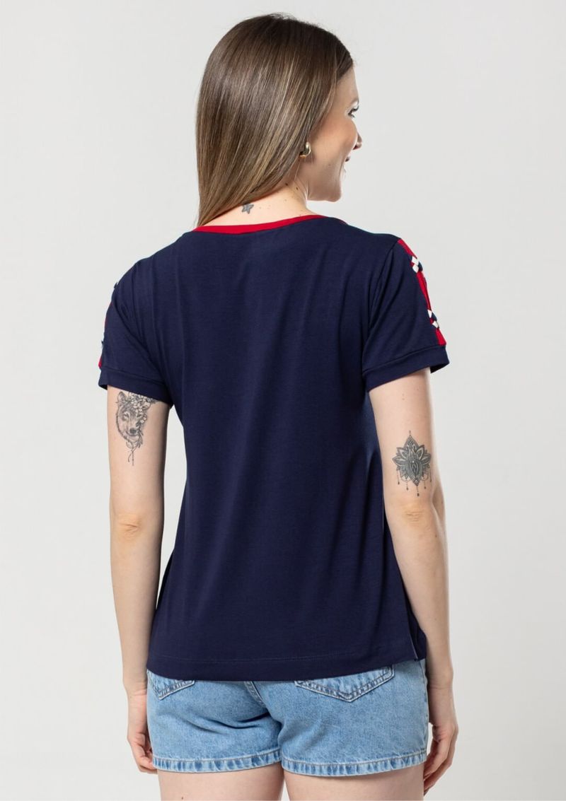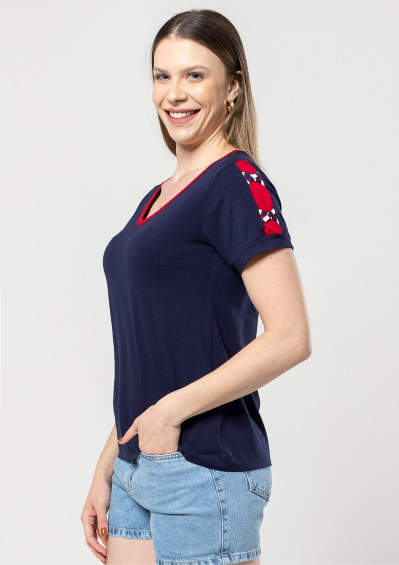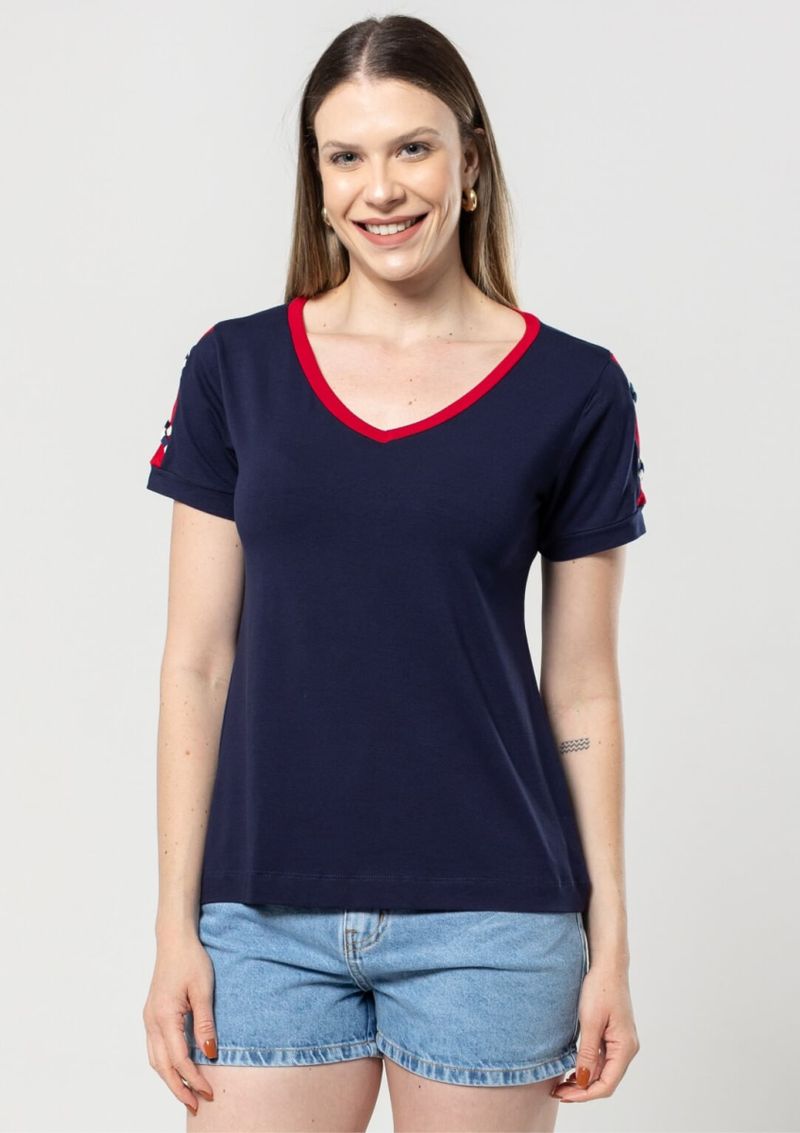 Blusa feminina decote em 'V' e mangas curtas. Modelo na cor Azul Marino com punho nas mangas. Possui recorte nas mangas na cor Vermelho e viés listrado em "X". Construída em viscolycra malha leve, confortável, ótima elasticidade e caimento incrível. Moderna e compõem diversos looks com muita elegância! Composição da malha: Confeccionado em 96% Viscose e 4% Elastano. Medidas Aproximadas: PP: 57cm Comprimento x 88cm Busto x 86cm Cintura x 92cm Quadril. P: 59cm Comprimento x 94cm Busto x 92cm Cintura x 98cm Quadril. M: 61cm Comprimento x 100cm Busto x 98cm Cintura x 104cm Quadril. G: 63cm Comprimento x 106cm Busto x 104cm Cintura x 110cm Quadril. GG: 65cm Comprimento x 112cm Busto x 110cm Cintura x 116cm Quadril. XL: 67cm Comprimento x 118cm Busto x 116cm Cintura x 122cm Quadril. Todos os dados informados são aproximados, do peso às medidas. ATENÇÃO PARA AS MEDIDAS. MODELAGEM AMPLA. *Modelo está usando o tamanho P*