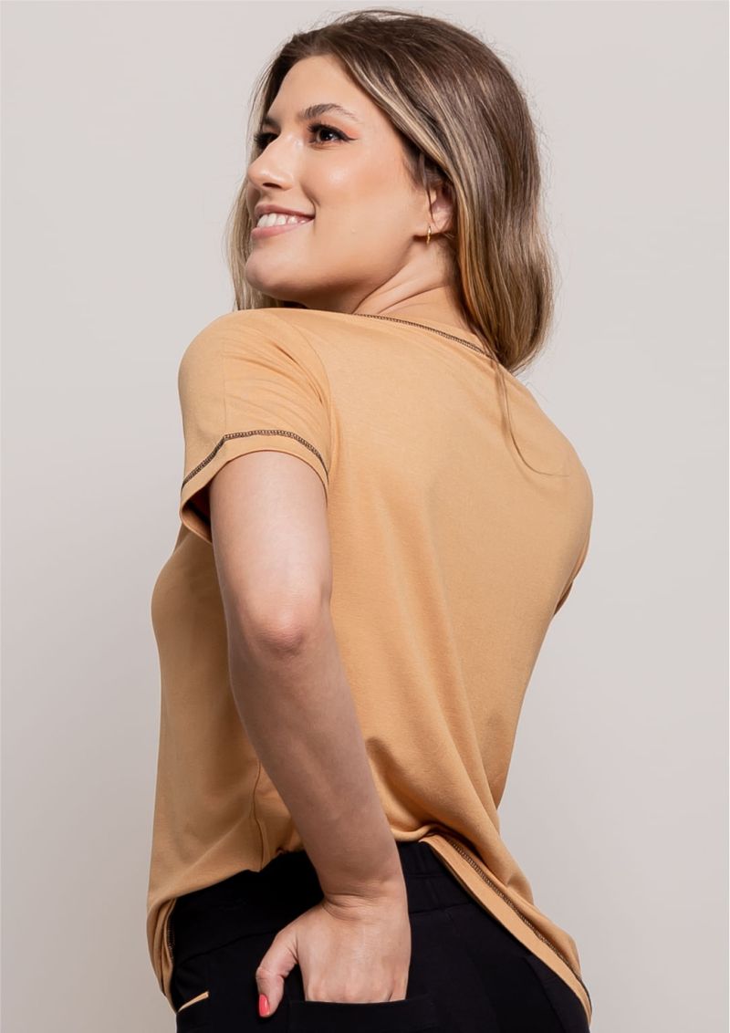 Blusa em malha básica, na cor Bege. Mangas curtas e decote redondo. Possui detalhe de costuras com trançador, na cor Preto. Moderna e confortável e despojada. Arrase! Composição da malha: 96% Viscose e 4% Elastano. Construída em "Viscolycra" com toque macio. Medidas Aproximadas: P: 62 x 94 x 96 x 104 cm (Comprimento, Busto, Cintura e Quadril). M: 64 x 100 x 102 x 110 cm (Comprimento, Busto, Cintura e Quadril). G: 66 x 106 x 108 x 116 cm (Comprimento, Busto, Cintura e Quadril). GG: 68 x 112 x 114 x 122 cm (Comprimento, Busto, Cintura e Quadril). XL: 70 x 118 x 120 x 128 cm (Comprimento, Busto, Cintura e Quadril). Todos os dados informados são aproximados, do peso às medidas. ATENÇÃO PARA AS MEDIDAS, POIS NOSSA MODELAGEM É AMPLA.