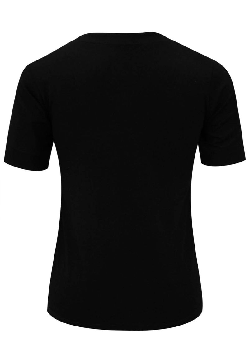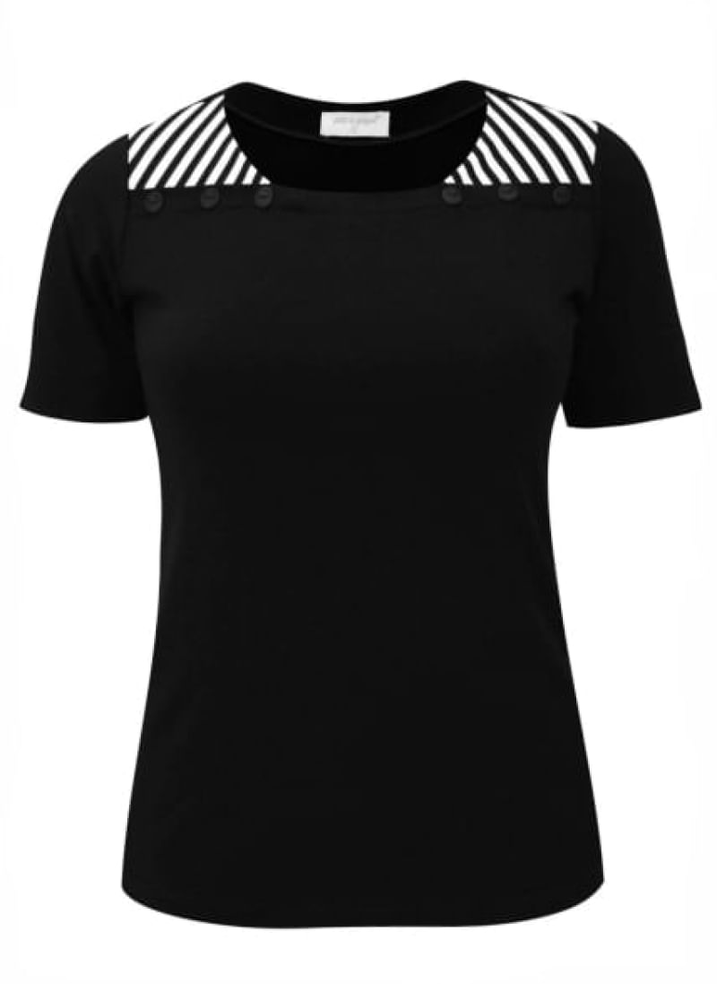 Blusa com decote redondo, composto por detalhe listrado e botões. Malha da blusa básica - Preto. Mangas Curtas. Modelagem da blusa, soltinha ao corpo. Moderna e confortável compõem diversos looks despojados. Arrase! Composição da malha: Confeccionado em 96% Viscose e 4% Elastano. Construída em "Viscolycra" com toque macio. Medidas Aproximadas: P: 62 x 92 x 94 x 106 cm (Altura, Busto, Cintura e Quadril). M: 64 x 98 x 100 x 112 cm (A, B, C, Q). G: 66 x 104 x 106 x 118 cm (A, B, C, Q). GG: 68 x 110 x 112 x 124 cm (A, B, C, Q). XL: 70 x 116 x 118 x 130 cm (A, B, C, Q). Todos os dados informados são aproximados, do peso às medidas.