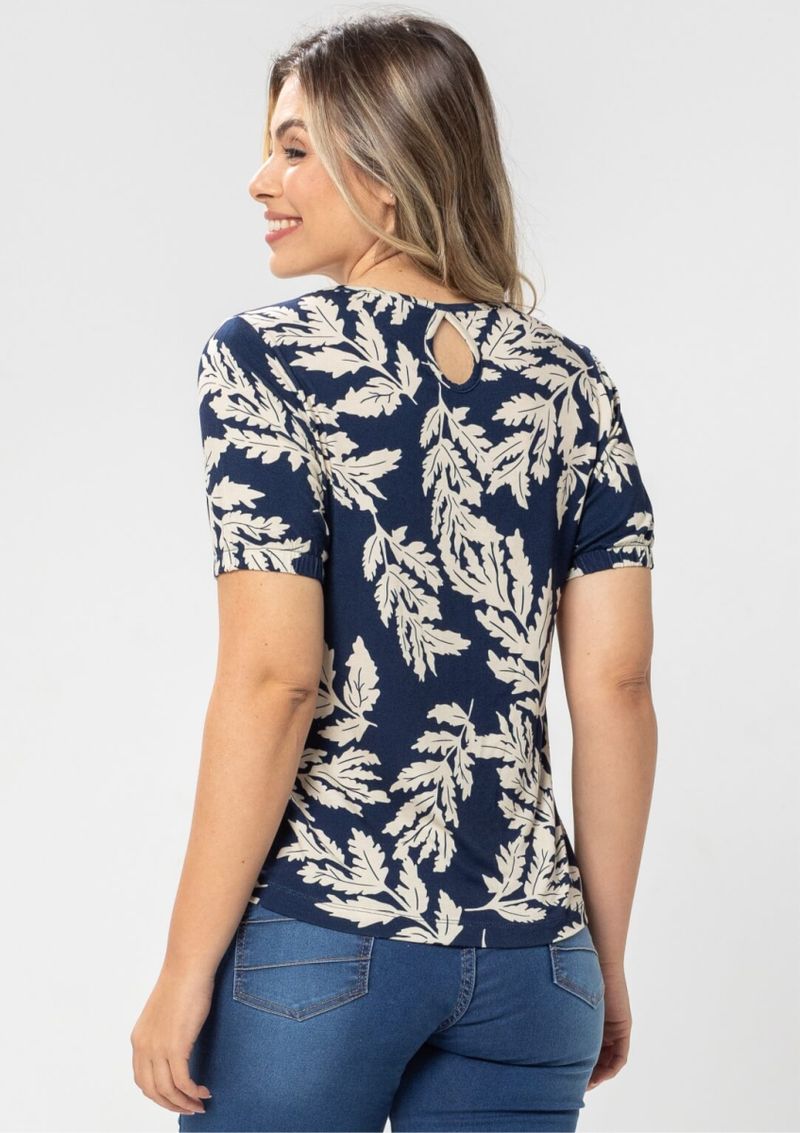 Blusa com decote redondo e mangas curtas. Estampada com folhagens sobre o fundo Azul Marinho e pequena abertura nas costas. Possui acabamento em elástico nas mangas para deixar a peça ainda mais charmosa. Modelo super feminino e versátil, é a escolha certa!!! Composição da malha: Confeccionado em 96% Viscose e 4% Elastano. Medidas Aproximadas: P: 59cm Comprimento x 90cm Busto x 96cm Cintura x 104cm Quadril. M: 61cm Comprimento x 96cm Busto x 102cm Cintura x 110cm Quadril. G: 63cm Comprimento x 102cm Busto x 108cm Cintura x 116cm Quadril. GG: 65cm Comprimento x 108cm Busto x 114cm Cintura x 122cm Quadril. XL: 67cm Comprimento x 114cm Busto x 120cm Cintura x 128cm Quadril. Todos os dados informados são aproximados, do peso às medidas. ATENÇÃO PARA AS MEDIDAS. MODELAGEM AMPLA.