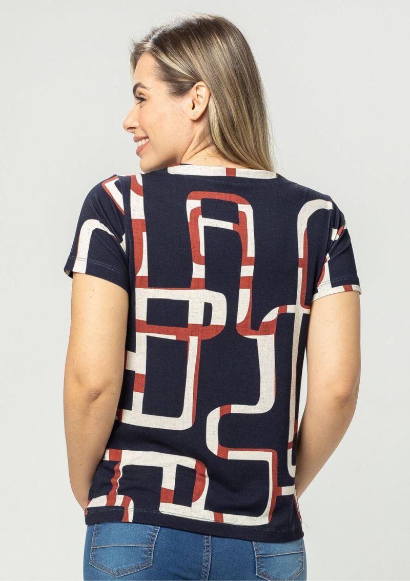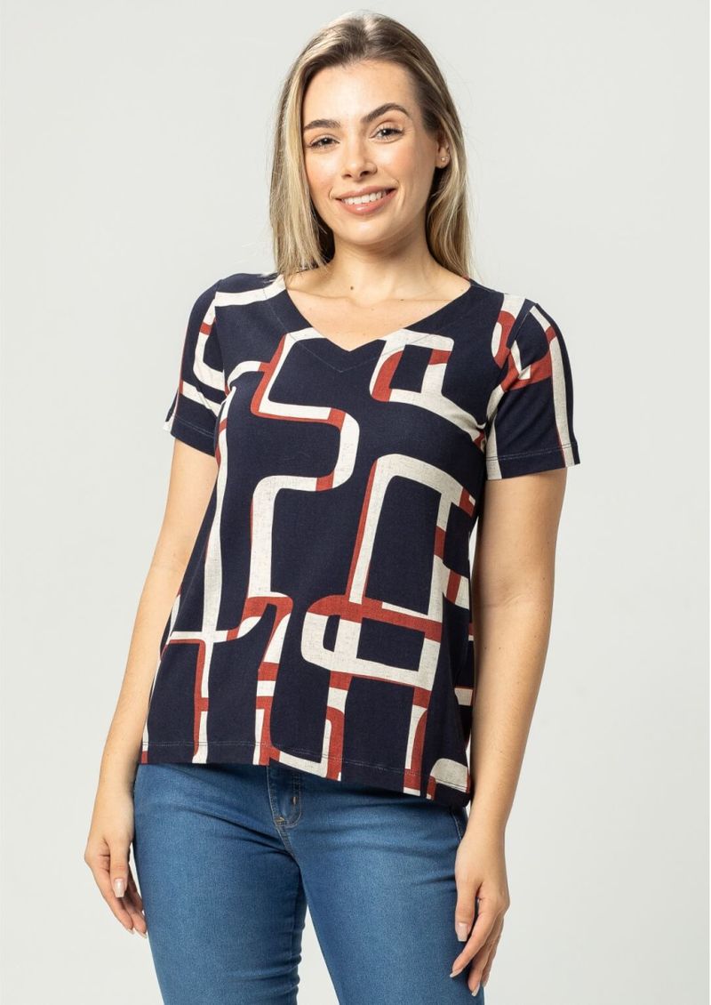 Blusa com decote em "V" e mangas curtas. Estampada em Vermelho e Off White sobre o fundo Azul Marinho. Modelo em Viscocrepe, tecido de excelente qualidade e alta durabilidade. Confortável, macio, leve com ótima capacidade de absorção. Permita-se!!! Composição da malha: Confeccionado em Viscocrepe 96% Viscose e 4% Elastano. Medidas Aproximadas: PP: 60cm Comprimento x 86cm Busto x 88cm Cintura x 98cm Quadril. P: 62cm Comprimento x92cm Busto x 94cm Cintura x 104cm Quadril. M: 64cm Comprimento x 98cm Busto x 100cm Cintura x 110cm Quadril. G: 66cm Comprimento x 104cm Busto x 106cm Cintura x 116cm Quadril. GG: 68cm Comprimento x 110cm Busto x 112cm Cintura x 122cm Quadril. XL: 70cm Comprimento x 116cm Busto x 118cm Cintura x 128cm Quadril. Todos os dados informados são aproximados, do peso às medidas. ATENÇÃO PARA AS MEDIDAS, POIS NOSSA MODELAGEM É AMPLA!
