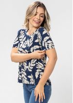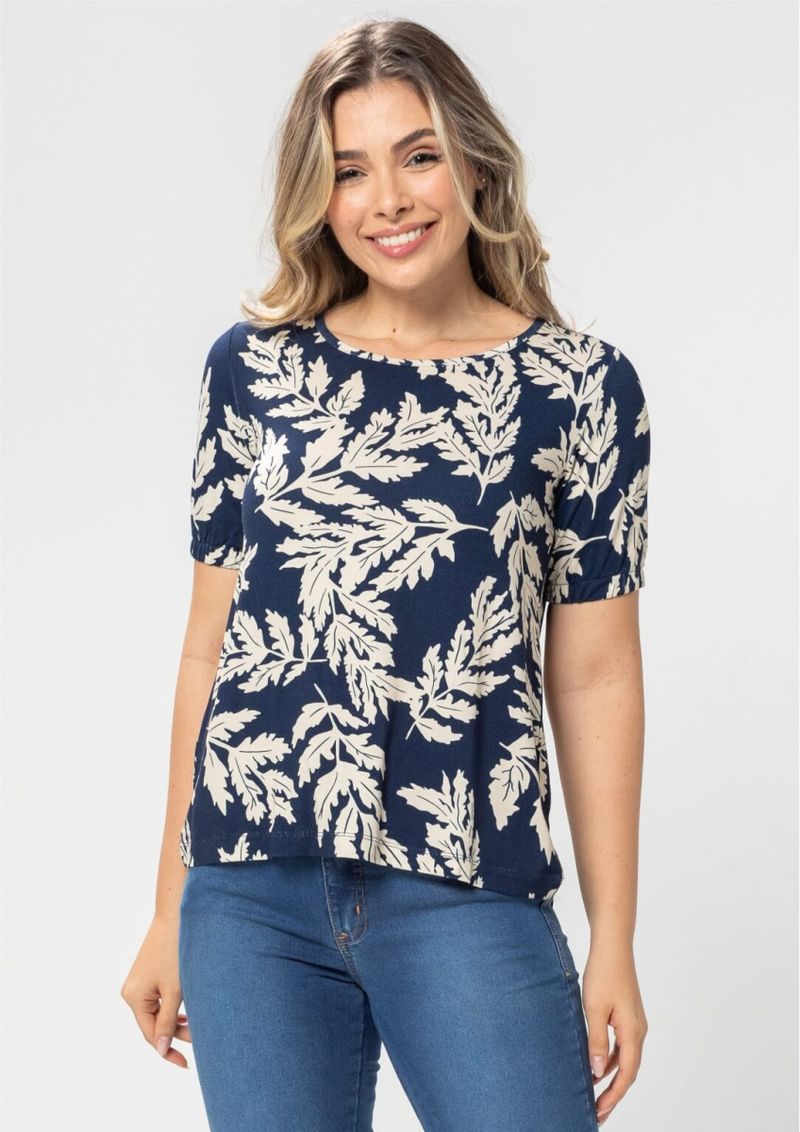 Blusa com decote redondo e mangas curtas. Estampada com folhagens sobre o fundo Azul Marinho e pequena abertura nas costas. Possui acabamento em elástico nas mangas para deixar a peça ainda mais charmosa. Modelo super feminino e versátil, é a escolha certa!!! Composição da malha: Confeccionado em 96% Viscose e 4% Elastano. Medidas Aproximadas: P: 59cm Comprimento x 90cm Busto x 96cm Cintura x 104cm Quadril. M: 61cm Comprimento x 96cm Busto x 102cm Cintura x 110cm Quadril. G: 63cm Comprimento x 102cm Busto x 108cm Cintura x 116cm Quadril. GG: 65cm Comprimento x 108cm Busto x 114cm Cintura x 122cm Quadril. XL: 67cm Comprimento x 114cm Busto x 120cm Cintura x 128cm Quadril. Todos os dados informados são aproximados, do peso às medidas. ATENÇÃO PARA AS MEDIDAS. MODELAGEM AMPLA.