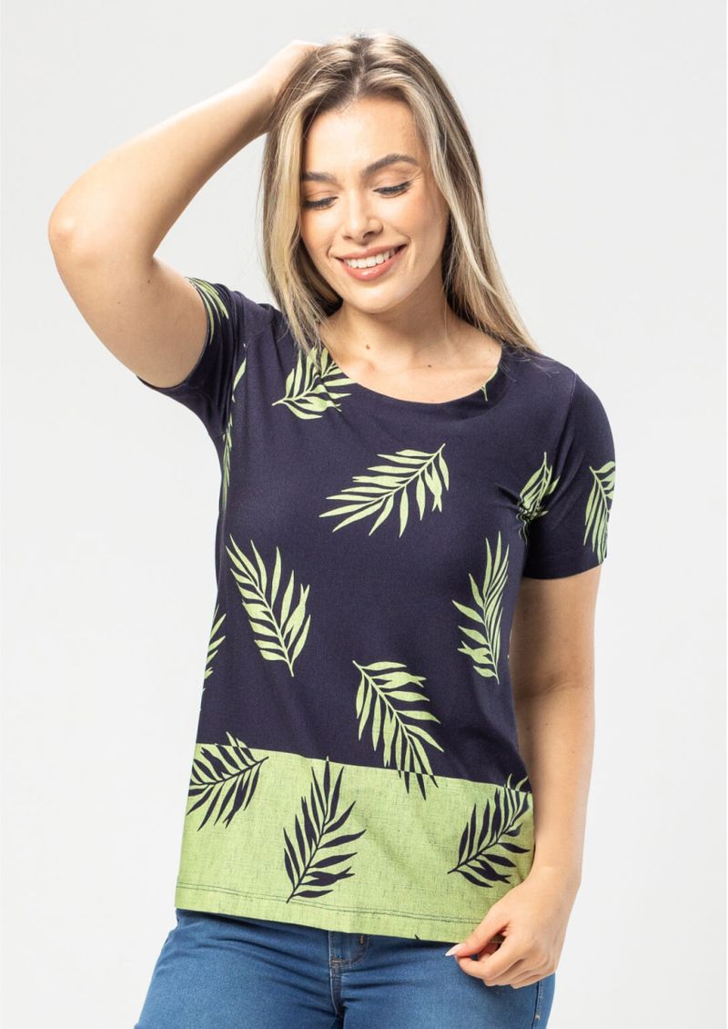 Blusa com decote redondo e mangas curtas. Modelo com parte frontal em duas cores parte superior em Azul Marinho e parte inferior em Verde. Costas toda em Azul Marinho ambos estampados por folhagens. Construída em Viscolycra - malha com leveza, super confortável e prática para o dia a dia. Composição da malha: Confeccionado em 96% Viscose e 4% Elastano. Medidas Aproximadas: P: 65cm Comprimento x 90cm Busto x 88cm Cintura x 98cm Quadril. M: 67cm Comprimento x 96cm Busto x 94cm Cintura x 104cm Quadril. G: 69cm Comprimento x 102cm Busto x 100cm Cintura x 110cm Quadril. GG: 71cm Comprimento x 108cm Busto x 106cm Cintura x 116cm Quadril. XL: 73cm Comprimento x 114cm Busto x 112cm Cintura x 118cm Quadril. Todos os dados informados são aproximados, do peso às medidas. ATENÇÃO PARA AS MEDIDAS. MODELAGEM AMPLA.