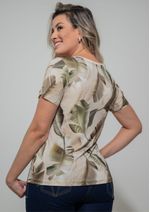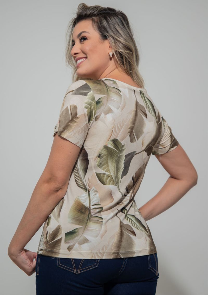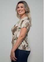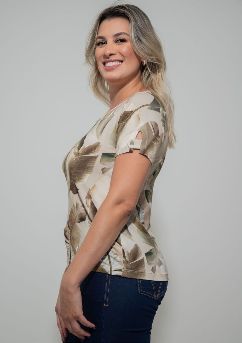 Blusa com decote redondo e estampa em tons de Bege e Verde. Possui mangas curtas - compostas por detalhe de abertura, lapela e botão. Modelagem da blusa, soltinha ao corpo. Confortável, elegante e linda. Permita-se! Composição da malha: Confeccionado em 96% Viscose e 4% Elastano. Construída em "Viscolycra" com toque macio. Medidas Aproximadas: P: 60 x 92 x 94 x 102 cm (Comprimento, Busto, Cintura e Quadril). M: 62 x 98 x 100 x 108 cm (Comprimento, Busto, Cintura e Quadril). G: 64 x 104 x 106 x 114 cm (Comprimento, Busto, Cintura e Quadril). GG: 66 x 110 x 112 x 120 cm (Comprimento, Busto, Cintura e Quadril). XL: 68 x 116 x 118 x 126 cm (Comprimento, Busto, Cintura e Quadril). Todos os dados informados são aproximados, do peso às medidas. ATENÇÃO PARA AS MEDIDAS. MODELAGEM AMPLA.