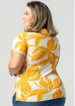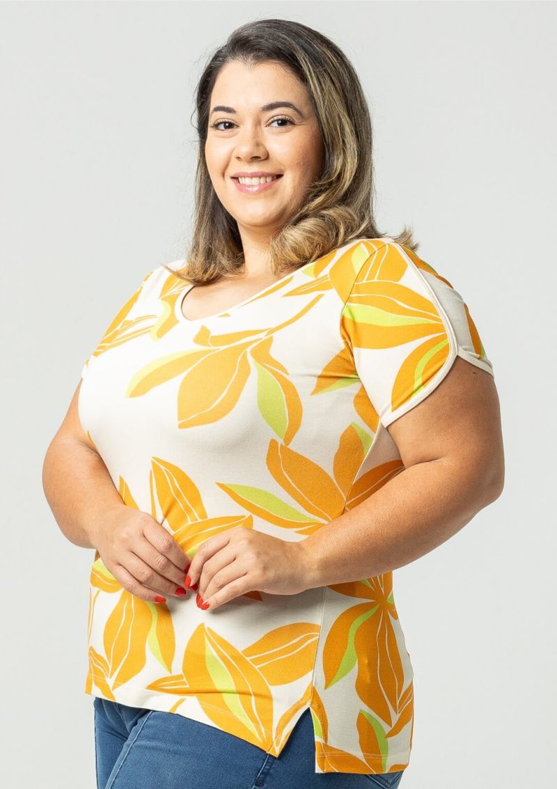 Blusa mangas curtas e decote em "V". Estampada em tons de Laranja, Verde e Off White. Possui acabamento em viés Off White no decote e mangas. Moderna e confortável. Permita-se! Composição da malha: Confeccionado em 96% Viscose e 4% Elastano. Medidas Aproximadas: P: 59cm Comprimento x 90cm Busto x 88cm Cintura x 96cm Quadril. M: 61cm Comprimento x 96cm Busto x 94cm Cintura x 102cm Quadril. G: 63cm Comprimento x 102cm Busto x 100cm Cintura x 108cm Quadril. GG: 65cm Comprimento x 108cm Busto x 106cm Cintura x 114cm Quadril. XL: 67cm Comprimento x 114cm Busto x 112cm Cintura x 120cm Quadril. Todos os dados informados são aproximados, do peso às medidas. ATENÇÃO PARA AS MEDIDAS. MODELAGEM AMPLA.
