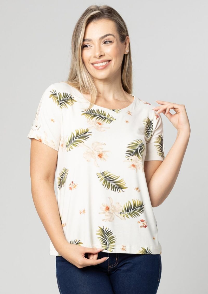 Blusa decote redondo e mangas curtas. Estampada com folhas e flores sobre o fundo Off White. Mangas com detalhe de entremeio e martingale com botão. O tecido em viscolycra é leve, confortável e tem um incrível caimento. Elegante, moderna e confortável. Aproveite!!! Composição da malha: Confeccionado em 96% Viscose e 4% Elastano. Medidas Aproximadas: PP: 60cm Comprimento x 84cm Busto x 86cm Cintura x 94cm Quadril. P: 62cm Comprimento x 90cm Busto x 92cm Cintura x 100cm Quadril. M: 64cm Comprimento x 96cm Busto x 98cm Cintura x 106cm Quadril. G: 66cm Comprimento x 102cm Busto x 104cm Cintura x 112cm Quadril. GG: 68cm Comprimento x 108cm Busto x 110cm Cintura x 118cm Quadril. XL: 70cm Comprimento x 114cm Busto x 116cm Cintura x 124cm Quadril. Todos os dados informados são aproximados, do peso às medidas. ATENÇÃO PARA AS MEDIDAS. MODELAGEM AMPLA.