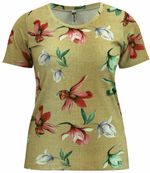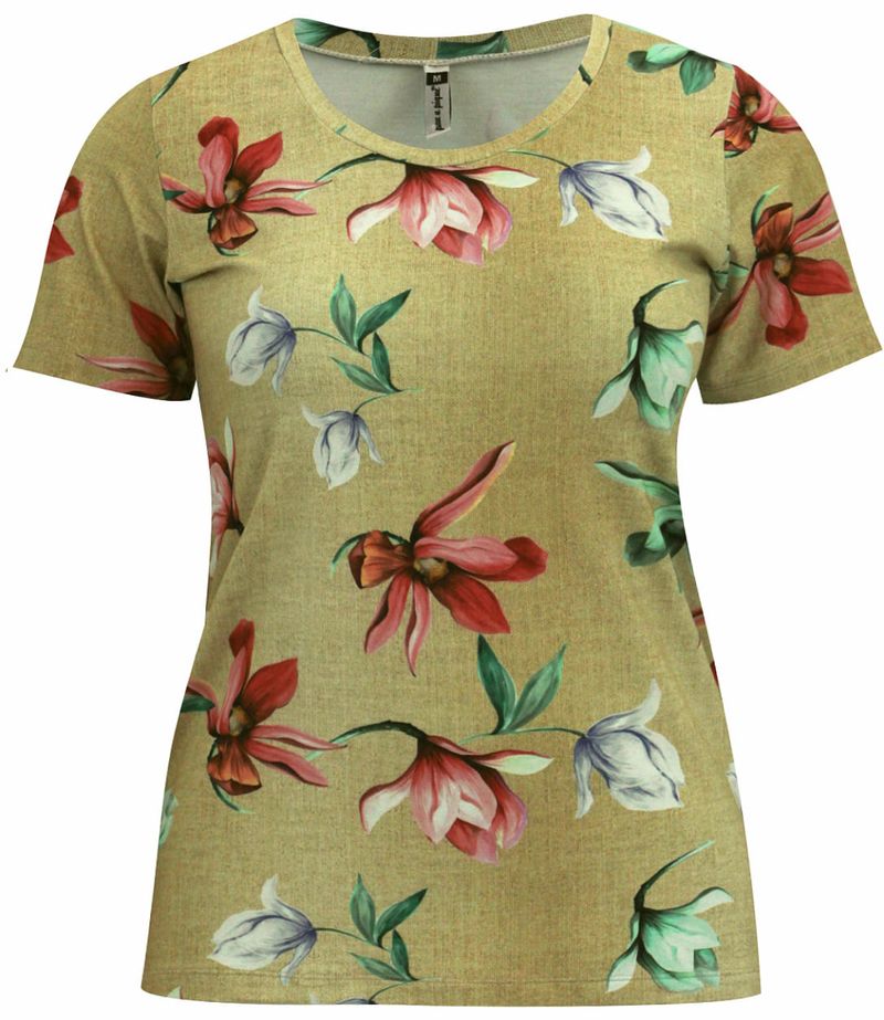 Blusa com decote redondo e mangas curtas. Malha estampada, sobre o fundo Palha. Confortável, elegante e linda. Arrase! Composição da malha: Confeccionado em 92% Viscose e 8% Elastano. Construída em "Viscolycra" com toque macio. Medidas Aproximadas: P: 63 x 90 x 92 x 104 cm (Altura, Busto, Cintura e Quadril). M: 65 x 96 x 98 x 110 cm (Altura, Busto, Cintura e Quadril). G: 67 x 102 x 104 x 116 cm (Altura, Busto, Cintura e Quadril). GG: 69 x 108 x 110 x 122 cm (Altura, Busto, Cintura e Quadril). XL: 71 x 114 x 116 x 128 cm (Altura, Busto, Cintura e Quadril). Todos os dados informados são aproximados, do peso às medidas. Atenção para as medidas, pois nossa modelagem é AMPLA.