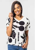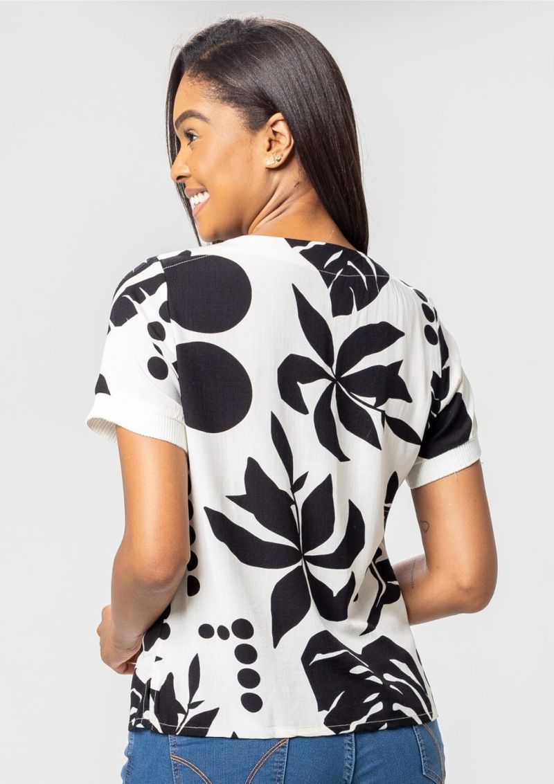 Blusa feminina estampada na cor Preto. Mangas curtas e decote em "V" ambos com acabamento em retilínea . Construída em Viscose uma fibra artificial de celulose, fabricada a partir de cavacos de madeira. Tecido leve, fresquinho, confortável e que transpira, ou seja, não retém calor. Te deixa pronta para encarar todos os desafios com elegância e feminilidade. Aproveite! Composição da malha: Confeccionado em 97% Viscose e 3% Elastano. Medidas Aproximadas: P: 59cm Comprimento x 102cm Busto x 98cm Cintura x 104cm Quadril. M: 61cm Comprimento x 108cm Busto x 104cm Cintura x 110cm Quadril. G: 63cm Comprimento x 114cm Busto x 110cm Cintura x 116cm Quadril. GG: 65cm Comprimento x 120cm Busto x 116cm Cintura x 122cm Quadril. XL: 67cm Comprimento x 126cm Busto x 122cm Cintura x 128cm Quadril. Todos os dados informados são aproximados, do peso às medidas. ATENÇÃO PARA AS MEDIDAS. MODELAGEM AMPLA. *Modelo está usando o tamanho P*